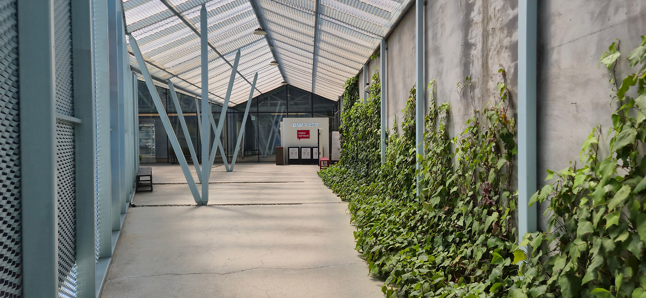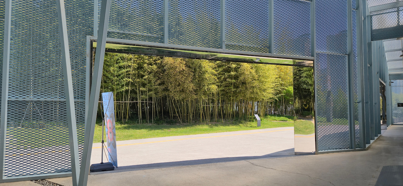메탈 구조물의 틈 사이로 대나무숲이 들어왔다.