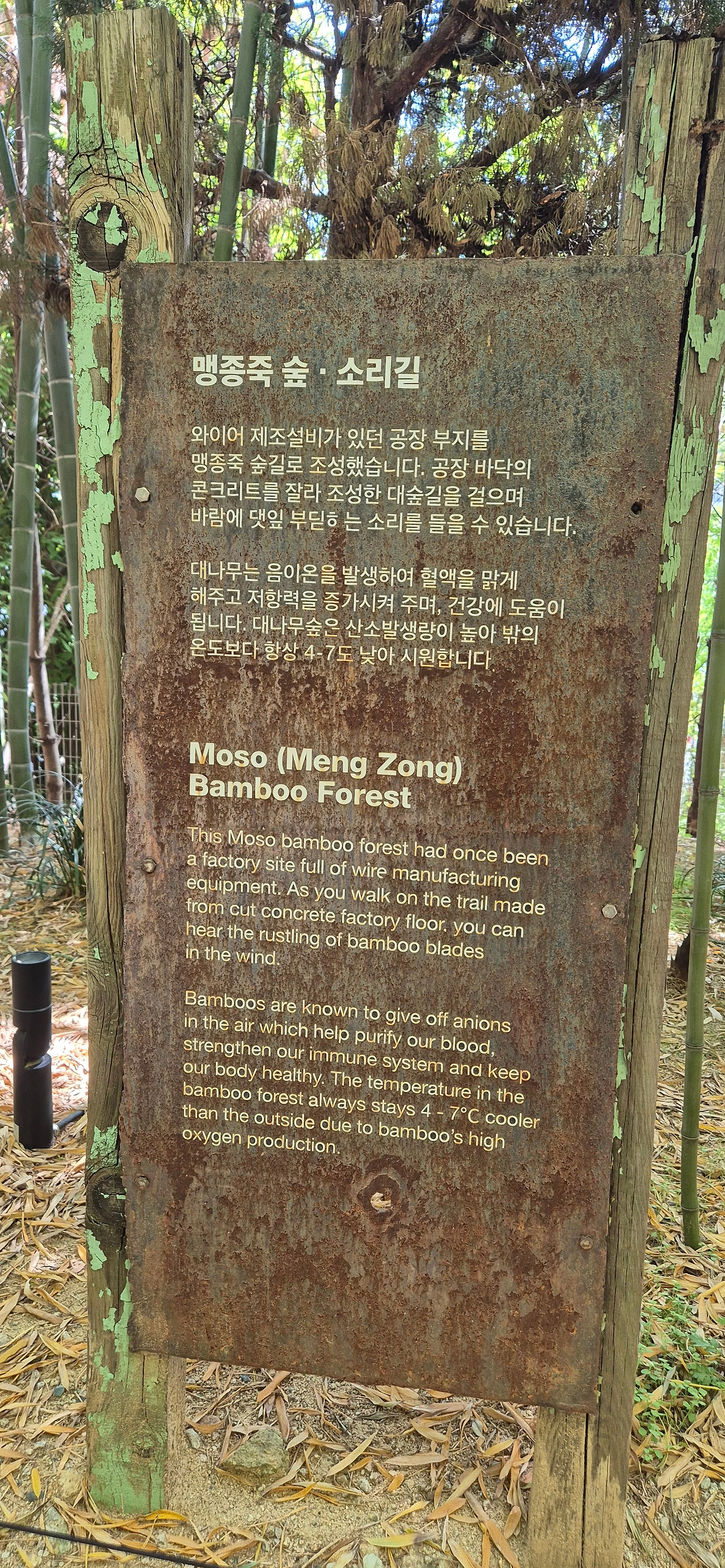 입구 옆에는 녹슨 철판 표지판이 서 있다.
