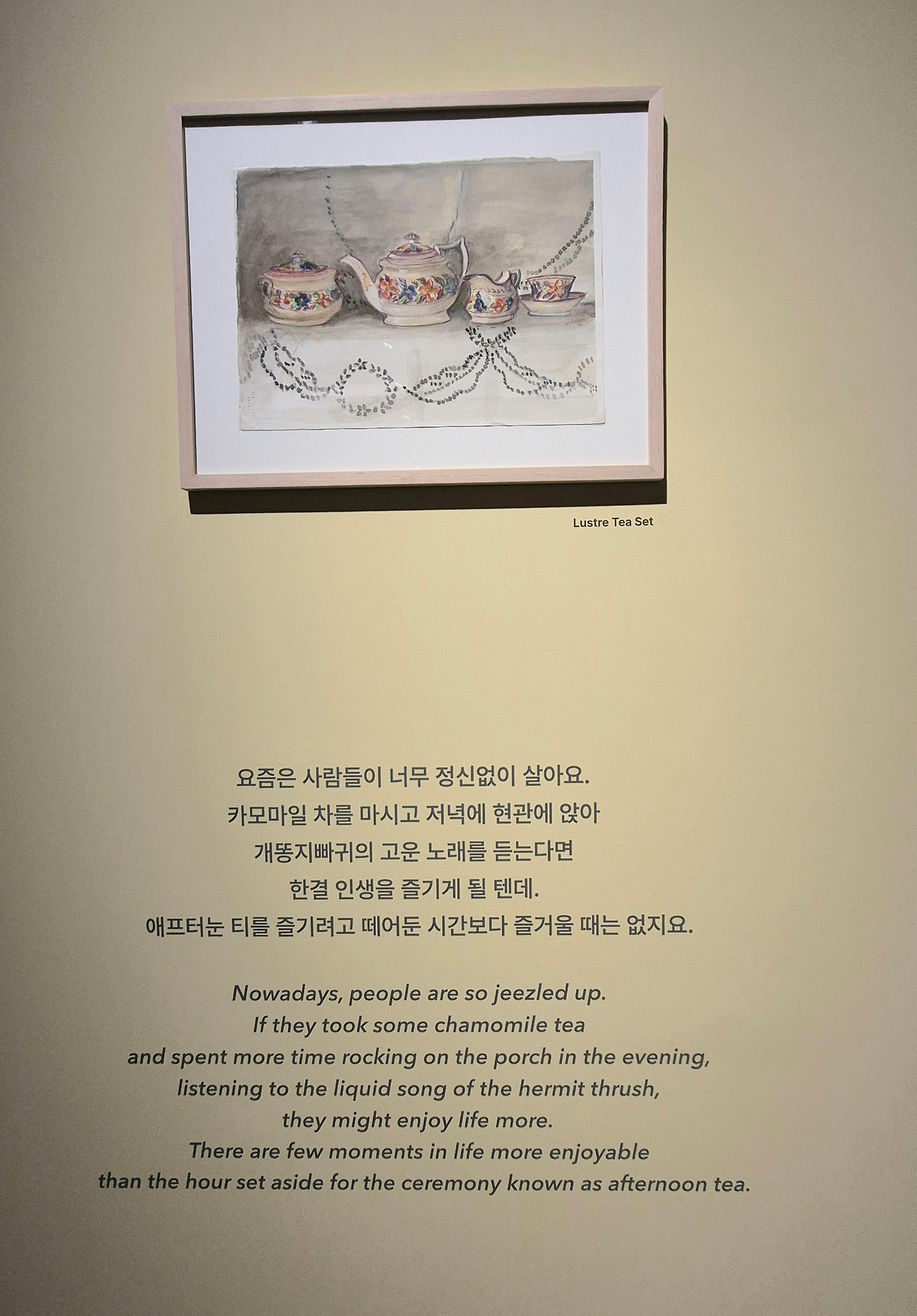 바쁜 생활 속 사물을 담은 수채화. 차를 마시는 시간과 하루의 호흡이 단정한 구도로 이어진다.