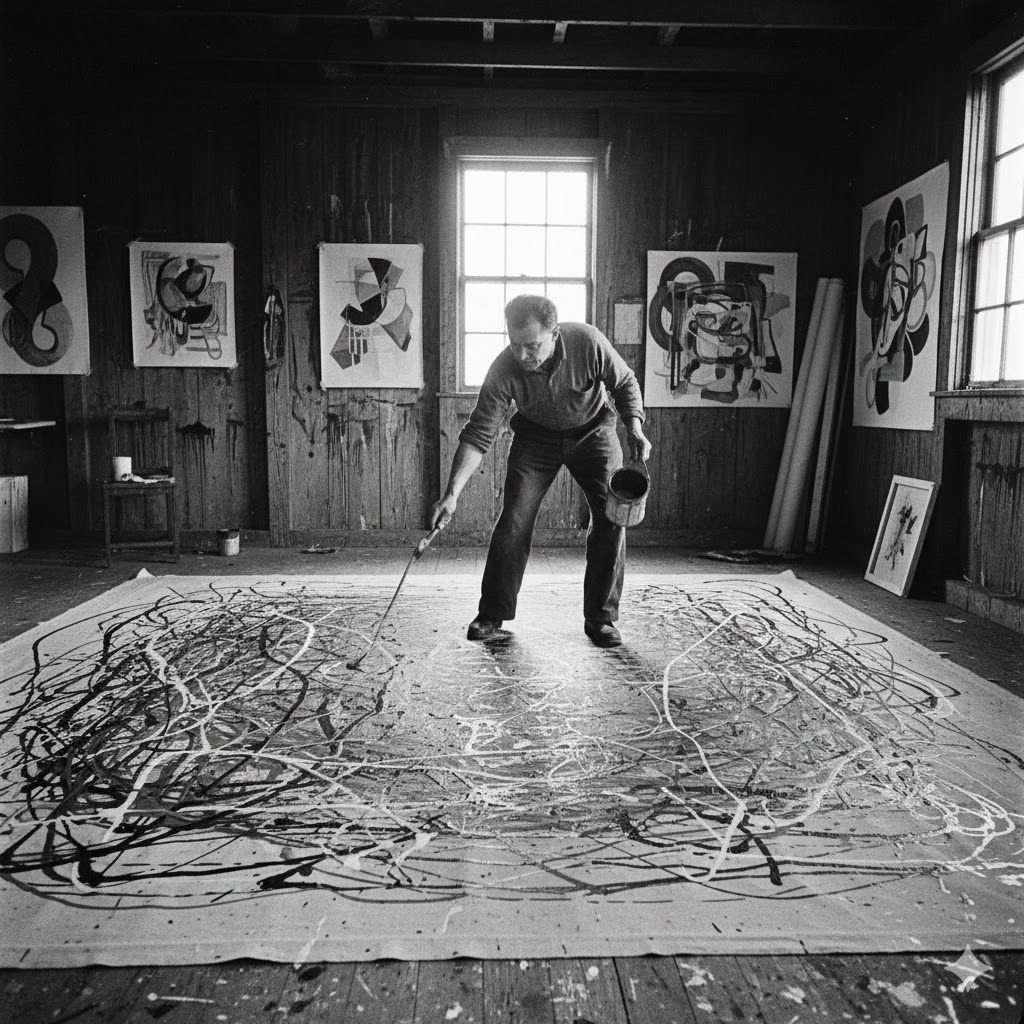 당시 사람들은 그의 작업 방식을 두고 '물감을 뿌리는 미친 짓'이라 비난하기도 했지만, 그는 흔들리지 않았다. 폴록에게 그것은 단순한 뿌리기가 아니라, 자신의 무의식을 현실의 평면 위에 투사하는 가장 정직한 방법이었기 때문이다. 그는 "그림은 스스로의 삶을 가지고 있다"라고 믿었고, 자신은 단지 그 삶이 캔버스 위에서 실현되도록 돕는 매개체일 뿐이라고 생각했다.