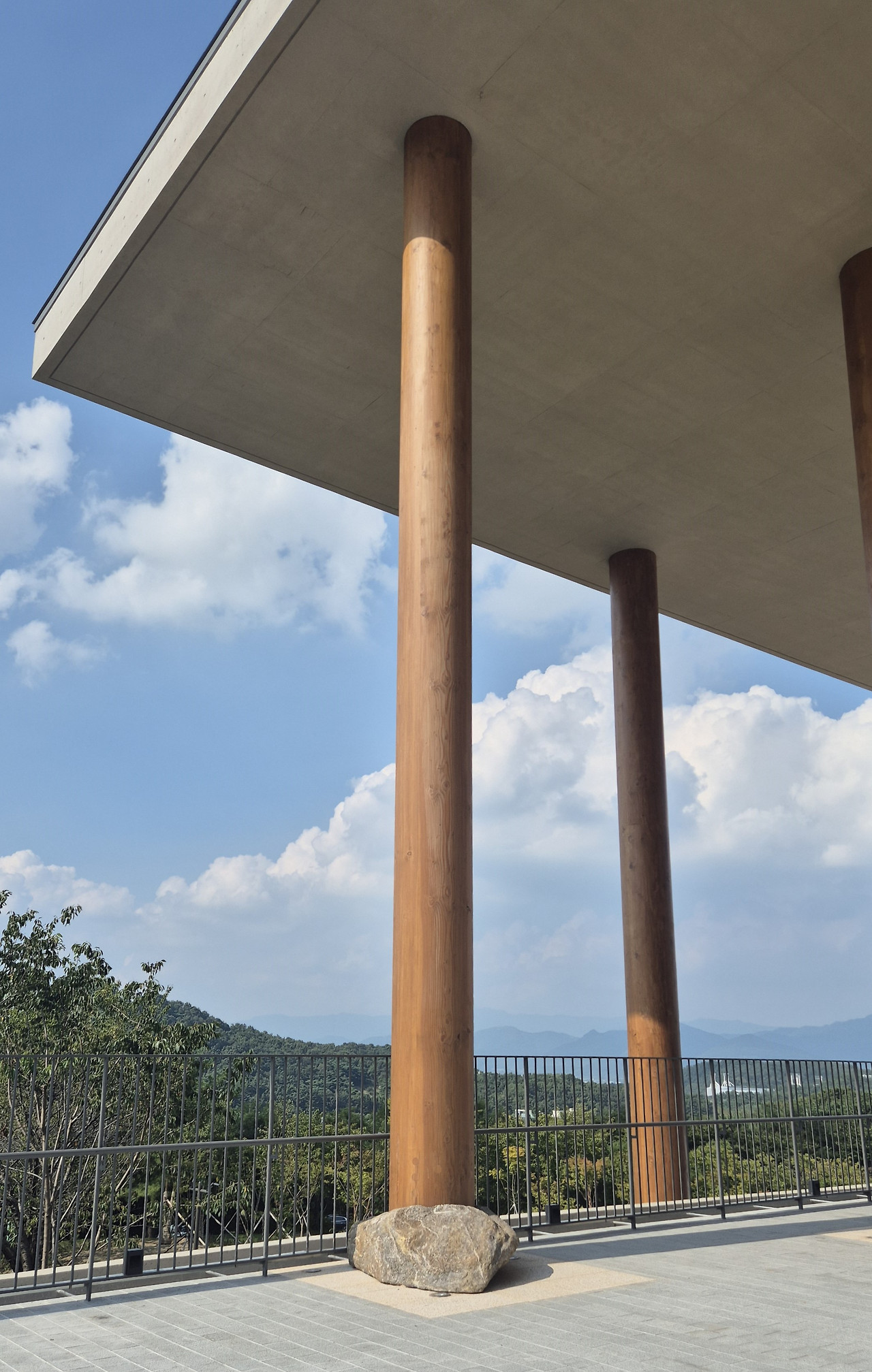 대구간송미술관 입구의 자연석을 기단으로, 하늘을 떠받치듯 서 있는 거대한 목재기둥. 그 사이로 푸른 하늘과 흰구름이 액자처럼 담겨있다. 시시각각 변하는 구름과 기둥에 부딪히는 햇살은 이곳만의 독특한 풍경을 빚어낸다.