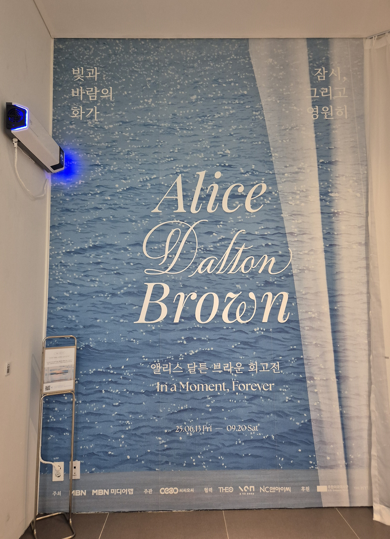 전시장 입구에 드리워진 긴 커튼을 걷고 들어가는 행위는 일종의 의식과도 같았다. 백화점의 번잡함은 얇은 천 하나를 사이에 두고 신기루처럼 멀어진다. 커튼 너머로 언뜻 비치는 푸른 바다는 이곳이 현실과 예술이 교차하는 지점임을 말해준다.