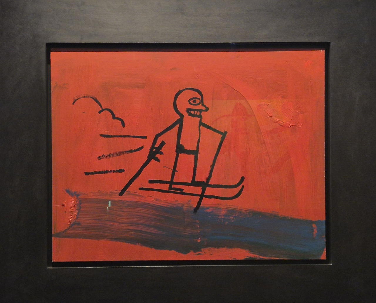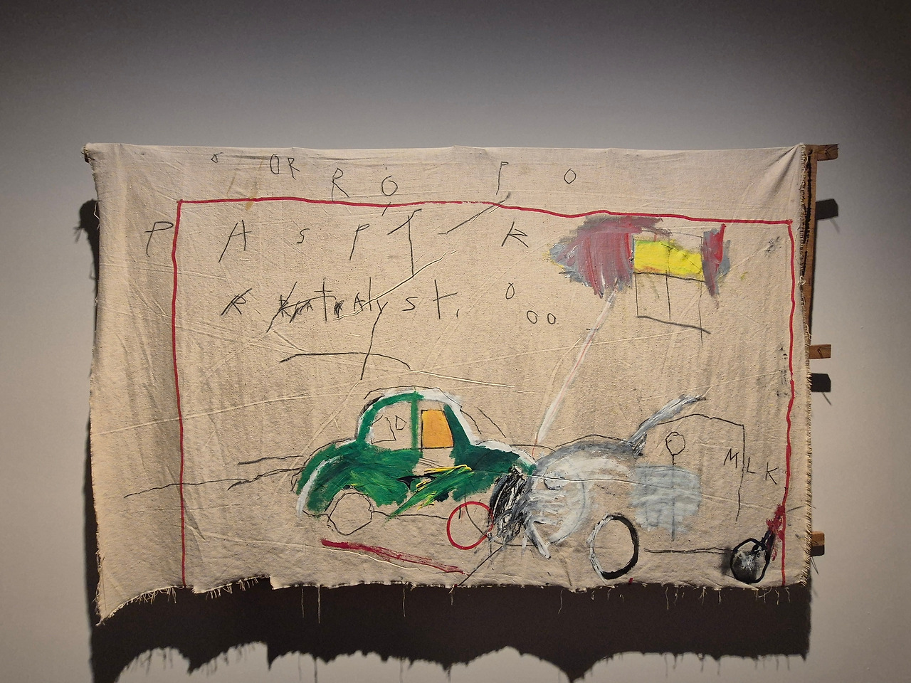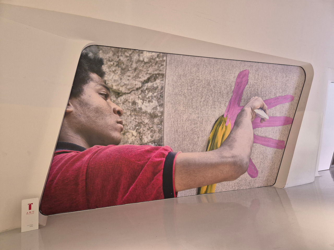 바스키아는 어린 시절 즐겨 본 만화를 언어로 삼아 굵은 선과 원색이라는 친숙한 대중의 언어로 세상을 해석했다. 단순한 선 안에는 세상과 정직하게 대화하려는 의지가 담겼다. 화면 속 만화 캐릭터는 익숙한 틀을 깨고 자신만의 길을 내는 유쾌한 풍자다.