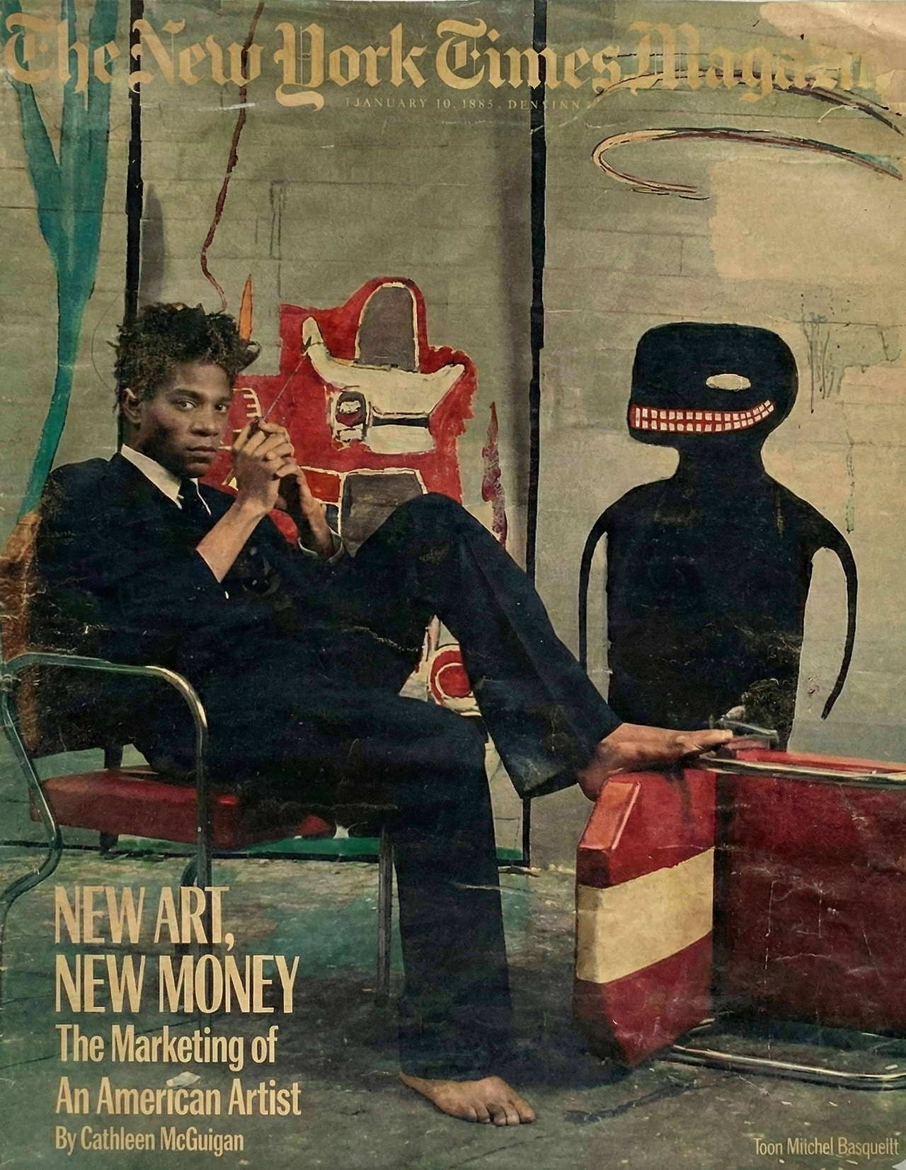 1985년 2월 10일 자 <뉴욕 타임스 매거진>의 표지를 장식한 사진이다. 바스키아는 당시 '뉴욕 주류 사회에 진입'을 상징하는 아르마니 정장을 차려입고 맨발로 앉아 정면을 응시한다. 등 뒤에 놓인 거친 그림들은 그가 지켜온 예술적 토대를 고스란히 보여준다.