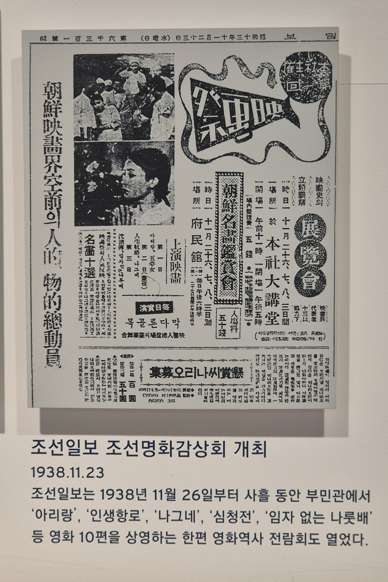 '아리랑', '심청전' 같은 영화 제목과 상영 시간, 입장료(50전)까지 상세히 적힌 활자들은 80여 년 전 사람들의 문화생활을 손에 잡힐 듯 생생하게 복원해낸다. 빽빽하게 채워진 한자 표기와 당시의 문체는 투박하지만, 단순히 정보를 전달하는 종이를 넘어, 당시 사람들의 뜨거운 관심과 설렘이 고인 '삶의 흔적' 그 자체였다.