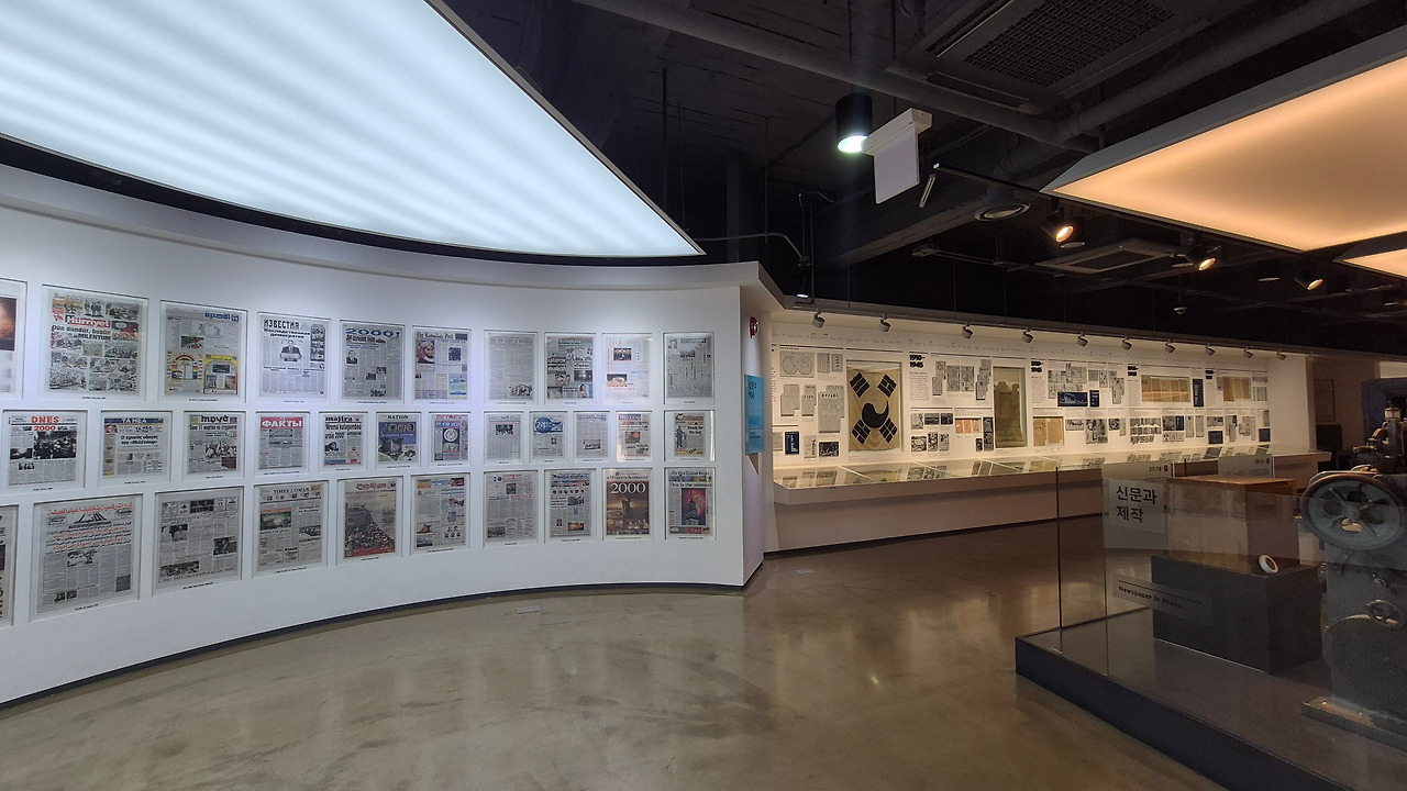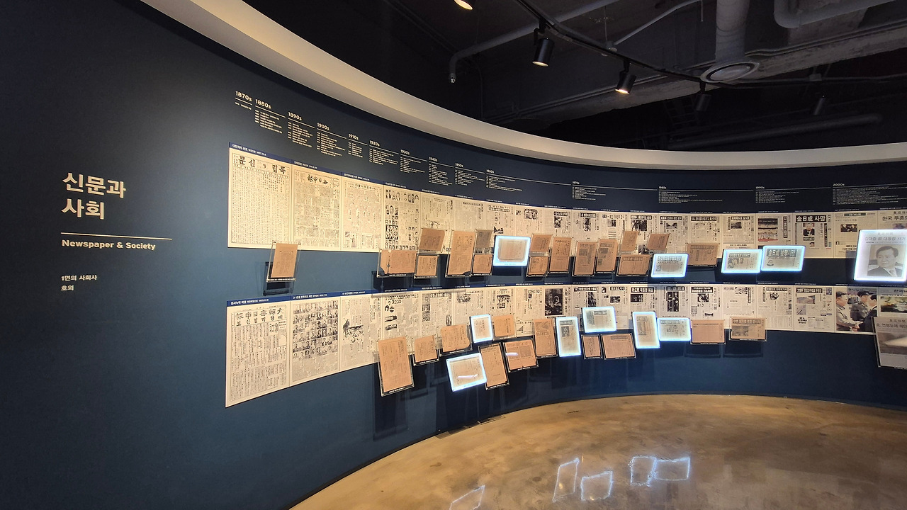 신문은 단순한 기록을 넘어 한 시대의 사회상을 비추는 거울이 된다. '신문과 사회' 섹션의 곡면 벽면을 가득 채운 1면 기사들은 대한민국의 굴곡진 현대사를 증언하고 있다.