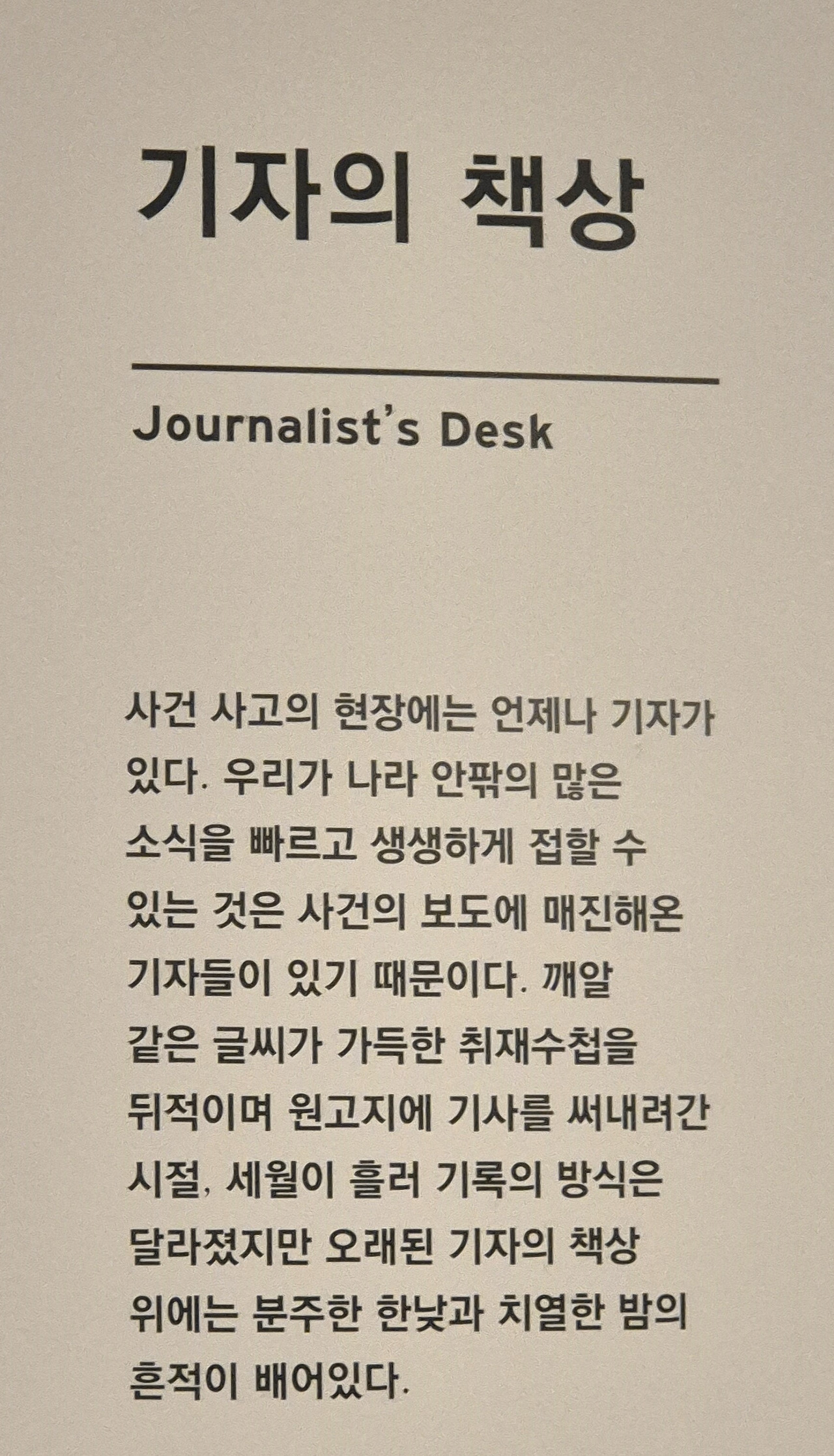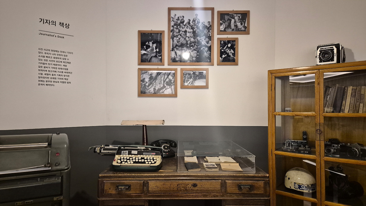 '기자의 책상'에는 분주했던 낮과 밤의 흔적이 배어 있다. 깨알 같은 글씨가 적힌 취재 수첩과 낡은 타자기에서 진실을 전하려 애쓴 기록의 무게가 느껴진다. 세월이 흘러 방식은 달라졌으나, 기사 한 줄을 위해 바친 정성이 오늘날 우리가 세상을 보는 눈이 된다.