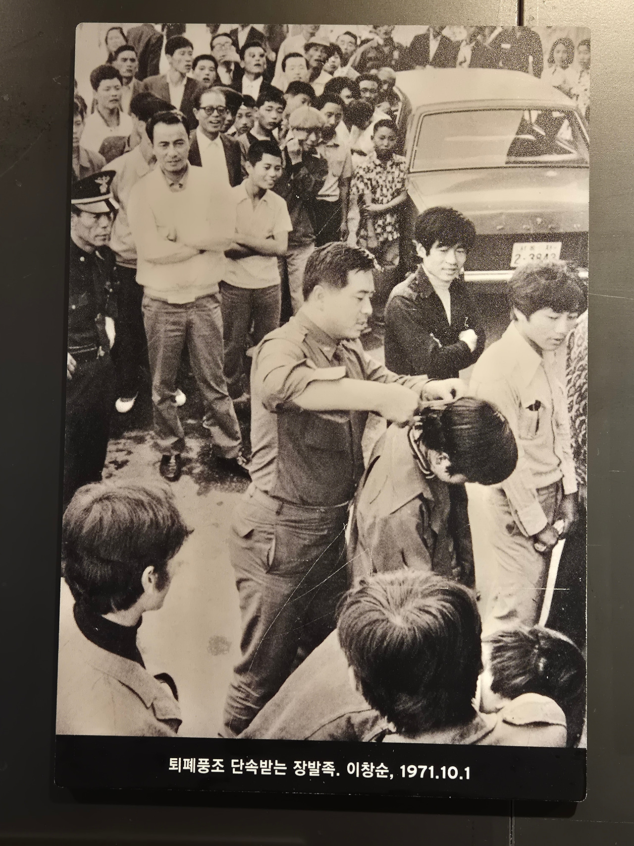1971년, 장발 단속을 피해 머리카락을 깎이는 청년의 모습은 개인의 취향조차 국가의 허락이 필요했던 유신시대의 억압을 상징적으로 보여준다. 흑백의 프레임 속에 갇힌 그 표정에서 당시 사회의 경직된 공기가 그대로 전해진다.