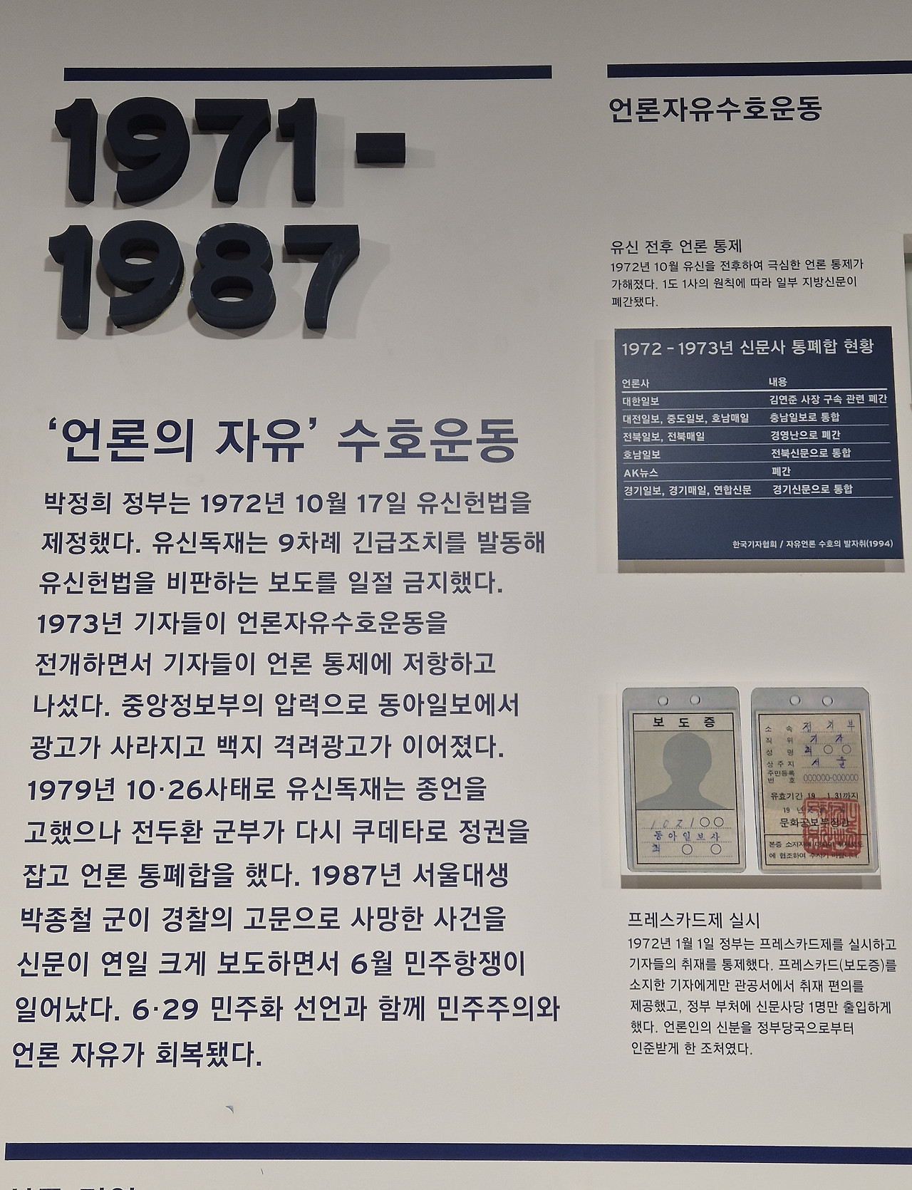 1970년대와 80년대, 유신독재와 언론 통제 속에서도 '언론의 자유'를 지키기 위해 저항했던 기자들의 보도증과 투쟁의 기록 앞에서는 발길이 무거웠다.