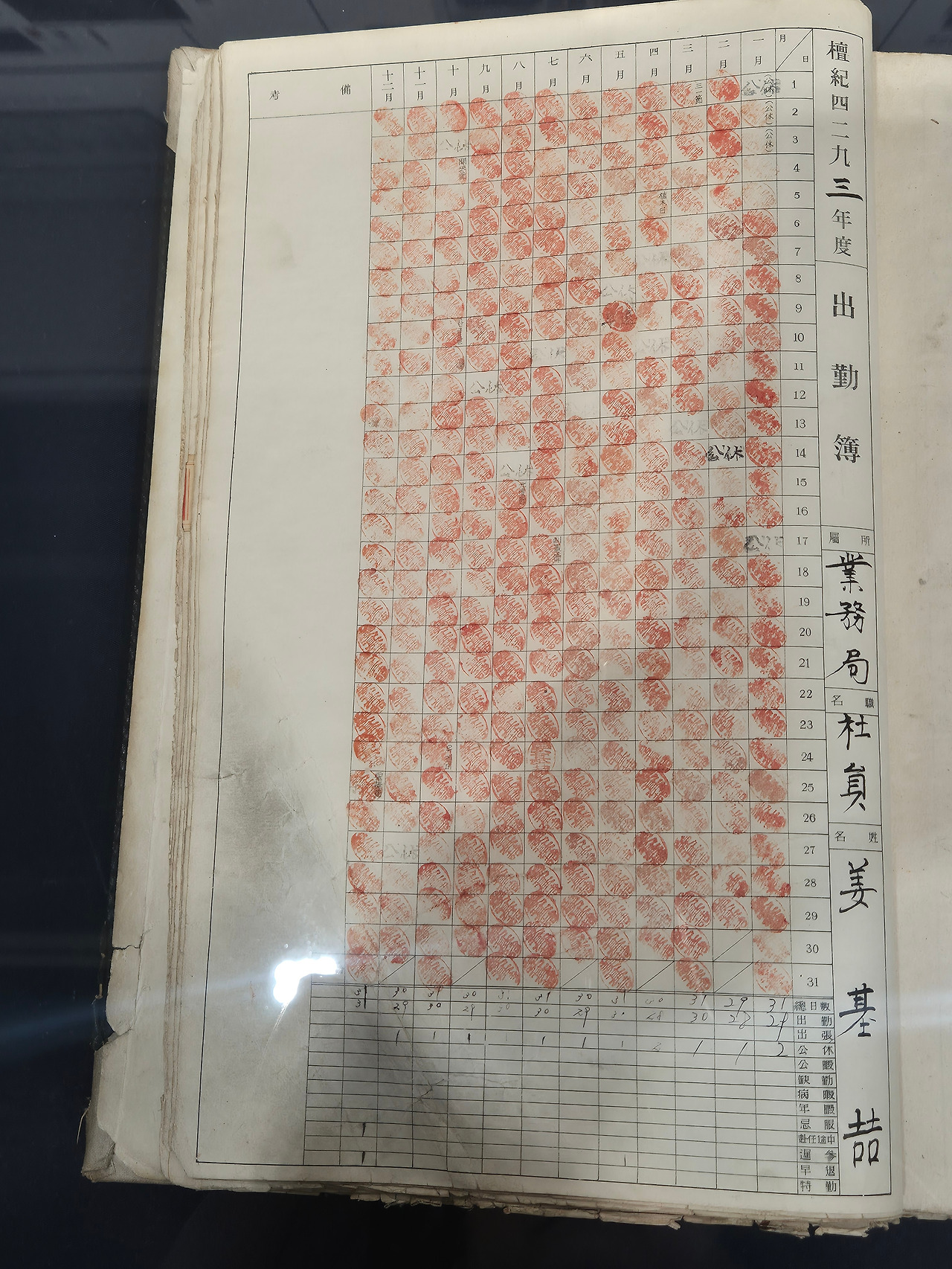 시대의 굴곡을 지나 다시 걸음이 멈춘 곳은 단기 4293년(서기 1960년)의 출근부 앞이다. 매일 아침 도장을 꾹 눌러 찍으며 하루의 시작을 알렸을, 진정한 아날로그의 기록이다. 어떤 날은 인주가 엷게 번져 있고 더러는 휴일의 빈칸도 보인다. 빛바랜 종이 위에 1년 12달을 꼬박 채운 붉은 표시들은 그 시절을 성실하게 살아낸 이의 치열한 흔적이자 인간적인 성실함이다.
