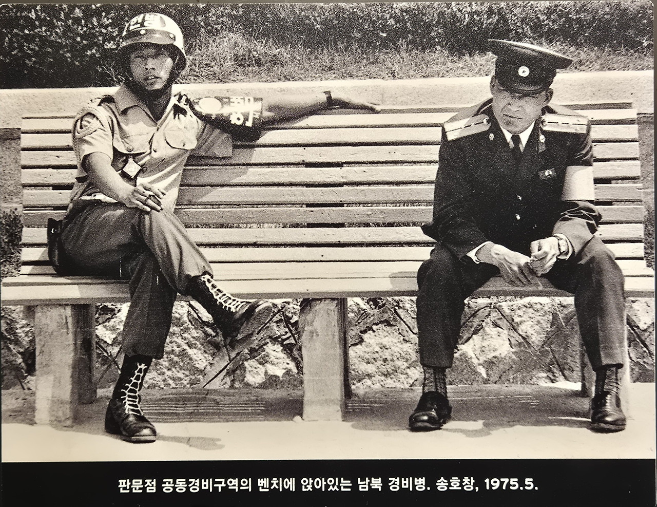 분단의 현실을 마주하게 하는 기록도 있다. 1975년 판문점 공동경비구역, 벤치에 나란히 앉아 있는 남북 경비병의 모습이다. 같은 곳을 바라보면서도 서로 다른 생각에 잠긴 듯한 그들의 모습은, 여전한 한반도의 긴장과 평화 사이를 보여주고 있었다.