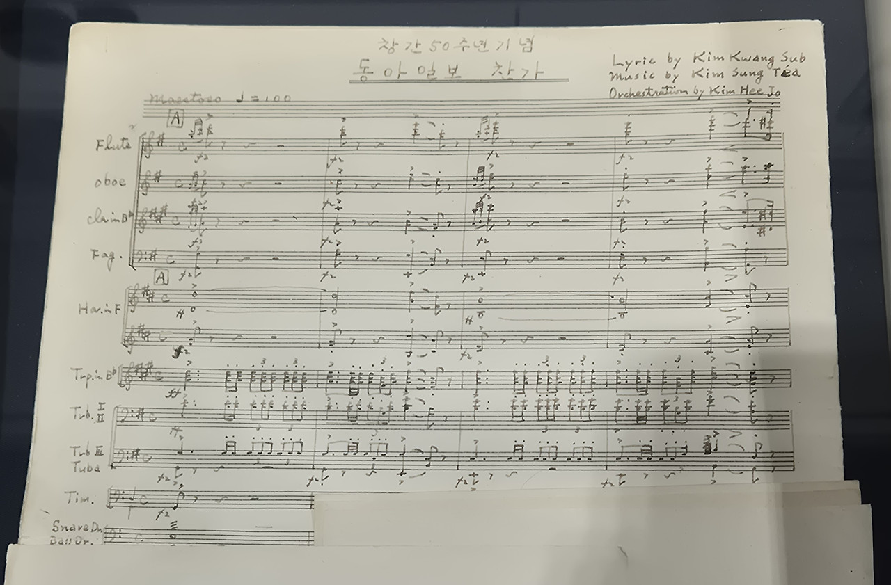 곁에는 무려 손으로 쓴 악보가 놓여 있다. 동아일보 창간 50주년을 기념해 만들어진 '동아일보 찬가'이다. 작사자와 작곡가의 이름은 물론, 왼편에 플루트와 오보에 등 오케스트라 악기명까지 상세히 적어 넣은 총보가 주는 울림이 크다. 한 줄의 기사를 쓰듯 정성껏 그려 넣었을 음표 하나하나에서, 신문이라는 매체를 향했던 당시 사람들의 경외심과 애정이 느껴진다.
