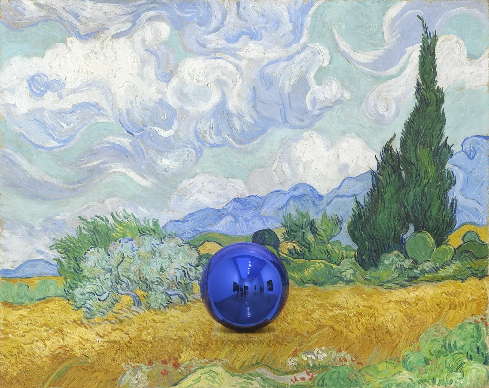 게이징 볼(Gazing Ball): 게이징 볼'은 원래 19세기 독일에서 정원 장식용으로 유행했던 유리 공이다. 쿤스는 이 소박한 장식물을 현대 미술의 맥락으로 가져와 '응시'와 '반사'의 철학을 담아냈다. 반 고흐의 '사이프러스가 있는 밀밭' 가운데 파란색 유리공, 게이징 볼이 놓여있다.