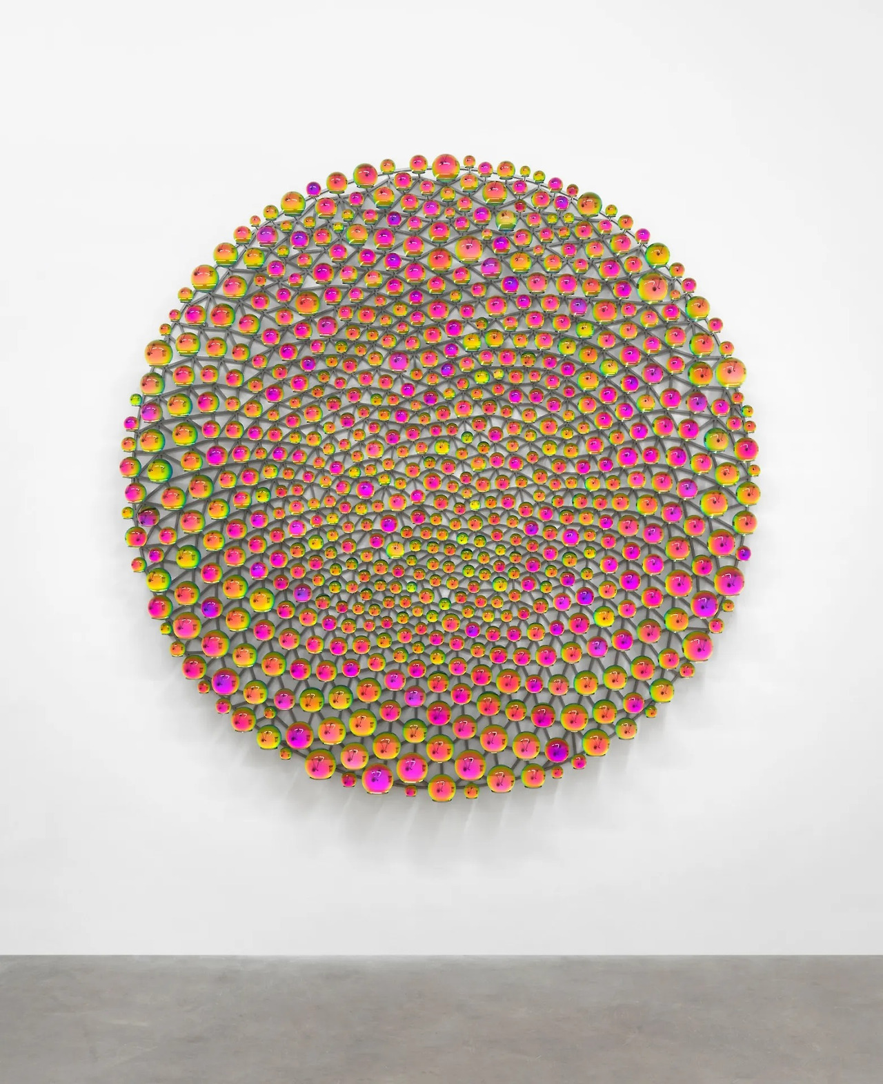 벽면을 가득 채운 작은 유리 구(球)들은 각각 하나의 렌즈 역할을 한다. 관객이 이 작품 앞에 서면, 수천 개의 유리알 속에 각기 다른 각도로 굴절된 무지개들이 맺힌다. 관객이 발걸음을 옮길 때마다 수천 개의 유리알 속 무지개는 일제히 그 색과 형태를 바꾼다. 내가 멈추면 빛도 멈추고, 내가 움직이면 빛도 살아난다.