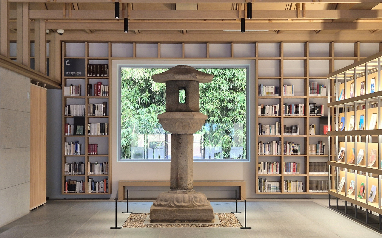 우선 진입의 미학이 있다. 건물이 박물관과 떨어져 있기에 대나무 숲길을 걷고 계단을 내려가는 '전환의 시간'이 생긴다. 관람의 들뜬 기분을 가라앉히고 사유의 모드로 들어가는 의식이 가능해진다. 다음은 본관의 인파와 소음으로부터 물리적 거리를 두는 덕분에 서고 안의 정적은 박물관 내부 도서관이 흉내 낼 수 없는 묵직함을 가진다.
