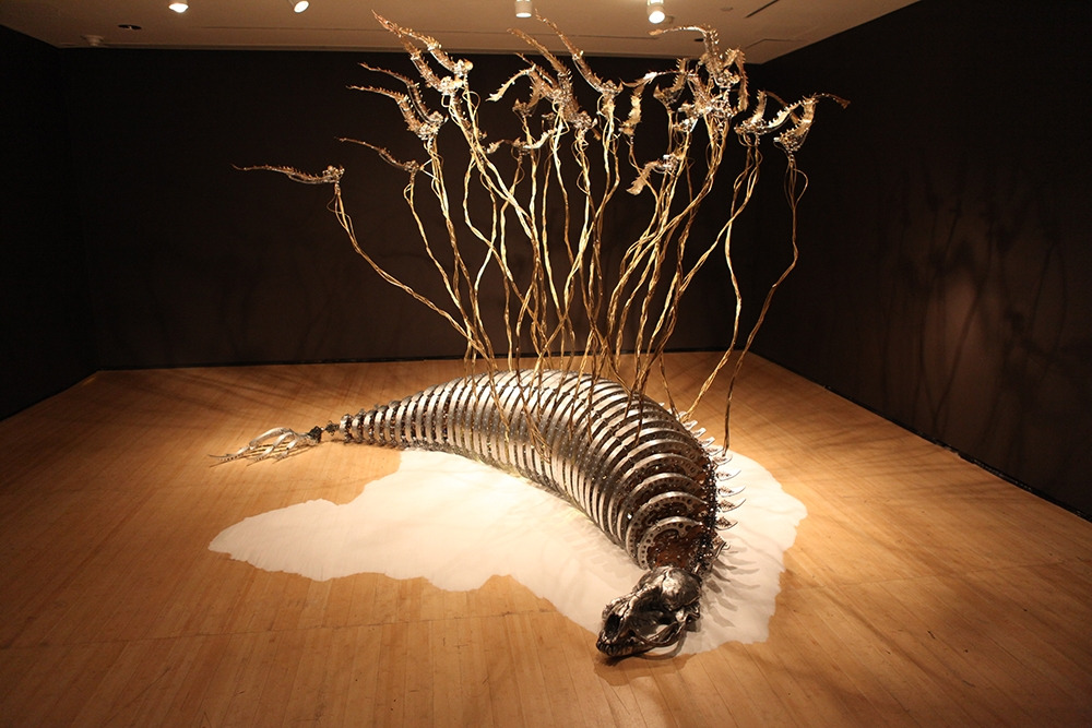 작가는 이 작품에 가상의 신화를 덧입혔다. 서로 다른 두 세계를 연결하던 구멍이 막히지 않도록 지키던 수호자가, 소통이 끊긴 현대 사회에서 서서히 소멸해 가는 과정의 기록이다. 뼈만 남은 몸체로 내뱉는 숨소리는 우리가 상실한 소중한 가치들에 대한 처절한 애도처럼 들렸다.