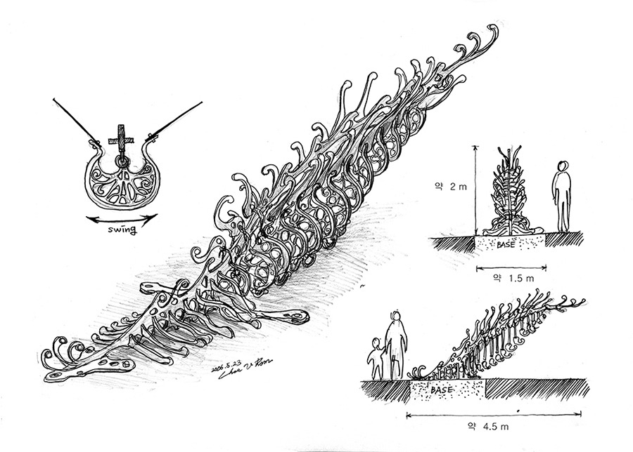 정교하게 맞물린 마디들이 움직이며 유연한 리듬을 만든다. 벽면에 비친 거대한 그림자는 차가운 역사 안을 깊은 바다로 바꾼다. 보이지 않는 에너지가 금속의 호흡으로 치환되는 순간, 무미건조한 지하철역은 신비로운 생태계가 된다.