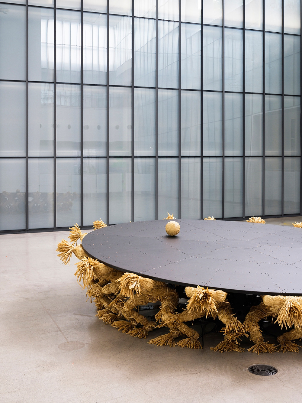 국립현대미술관 서울박스의 높은 층고 아래, 거대한 검은 원탁이 놓여 있다. 탁자 위에는 하나의 머리가 굴러다니고, 아래에는 머리 없는 지푸라기 몸체들이 등을 맞댄 채 이를 떠받친다.