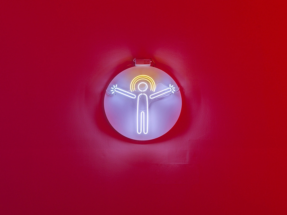 방주 뒷벽에는 날개를 잃은 듯 위태롭게 매달린 천사가 있다. 구원의 상징이어야 할 존재가 힘없이 축 늘어진 채 방주의 뒷모습을 지켜보는 풍경은 항해의 비극의 깊이를 더한다. 그 곁에는 붉은빛의 사인이 놓여 있다. 인체 형상에서 사방으로 뻗은 화살표는 현대 문명이 주는 피로와 혼돈의 상징이다. 모든 방향을 가리키기에 정작 어디로도 갈 수 없는 이 붉은 신호등은, 구원이 사라진 자리를 대신한 차가운 이정표이자 우리를 가둔 보이지 않는 벽이다.