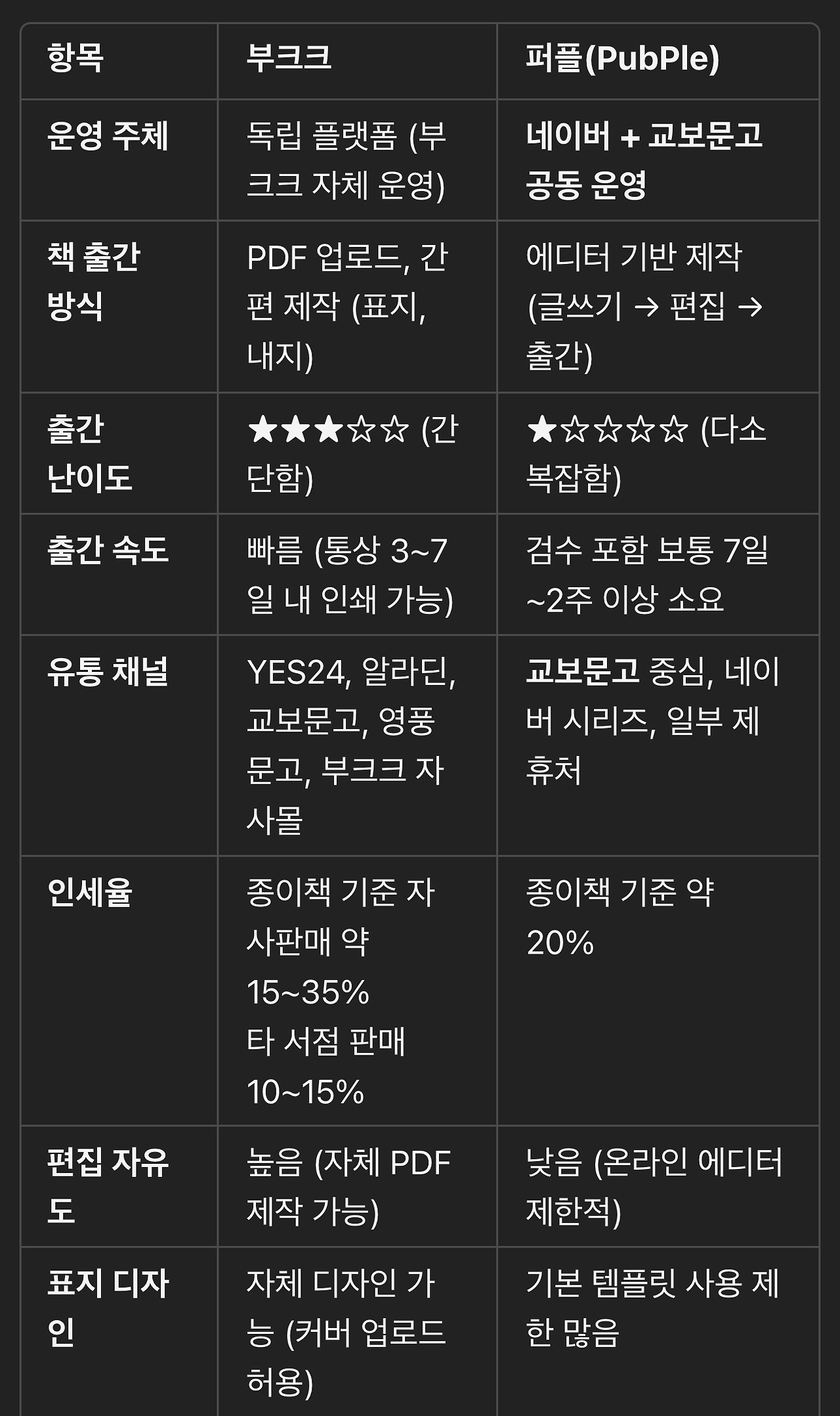이후 나는 대표적인 두 자가출판 플랫폼, **‘부크크’와 ‘퍼플(PubPle)’**을 비교해 보았다.