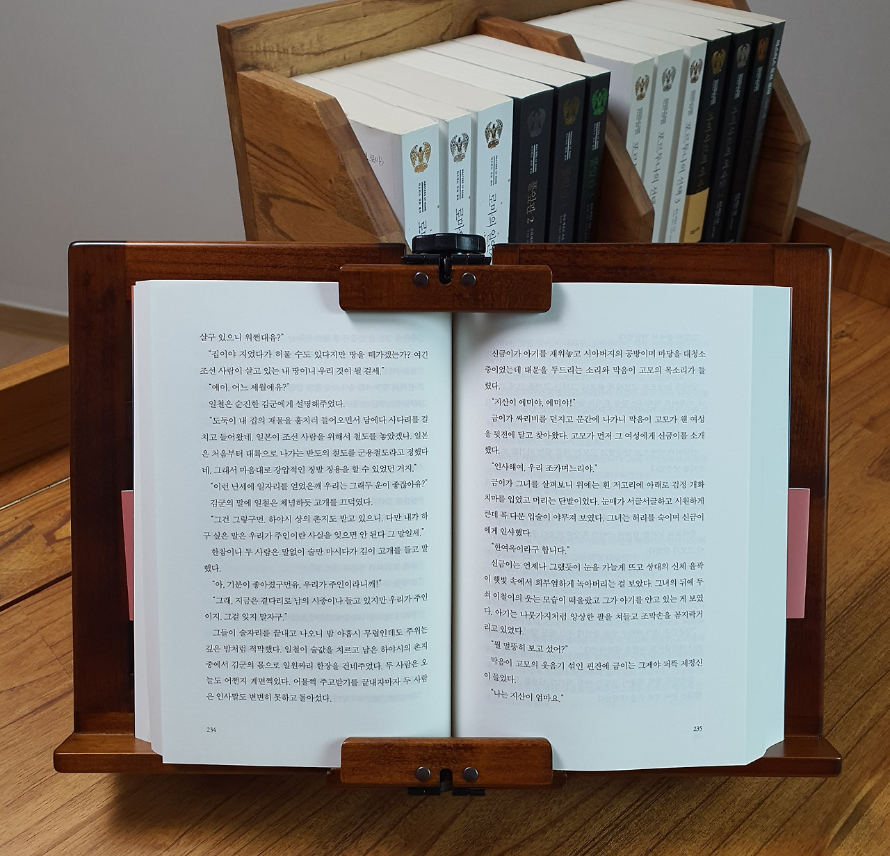 그러던 어느 날 책을 읽다가 문득 일체유심조가 생각났다. 독서라는 것이 어떨 때는 “안광(眼光)이 지(紙)의 배(背)를 투(透)하고 철(徹)”할 정도로 몰입하는 행위여야 하는 것이거늘, 책장을 넘기는 일이 번거로운 일이 되도록 바삐 책장을 넘겨서야 되겠는가? 모름지기 책 읽기가 모래 속에서 보석을 찾듯 꼼꼼히 살피고, 눈(雪) 아래 묻힌 봄꽃을 찾듯 보이지 않는 행간의 뜻을 찾아 읽는 것이라면, 독서대의 경첩을 제치고, 책장을 넘기고, 다시 경첩을 제자리로 되돌려 책을 고정하는 것은 불편하고 불필요한 행위가 아니라 꼭 필요한 일이지 않겠는가? 생각해 보니 독서대는 천천히 뜻을 새겨 읽고, 그것을 또 음미하고 곱씹으며 읽고, 행간의 의미를 읽어내는 시간을 가지라고 아주 자연스럽게 그 번거로운 과정들을 주고 있는 것이었다.