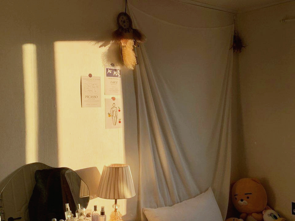 화장대, 선반, 책꽂이, 옷, 커튼, 침대 시트, 의자.. 마음에 안 들지만 참고 살았던 대부분의 것들을 버렸다. 몇몇 버리지 못한 고가의 가전이나 교체할 수 없는 더러워진 벽지, 장판은 패브릭, 포스터, 러그를 활용해 눈에 띄지 않게 가렸다. 조리 공간의 곰팡이 낀 타일 위로 네모난 격자 디자인의 접착 시트를 붙이고 얼룩진 침대 벽면에 손바느질 한 하얀 리넨 천을 걸어두는 식이다.