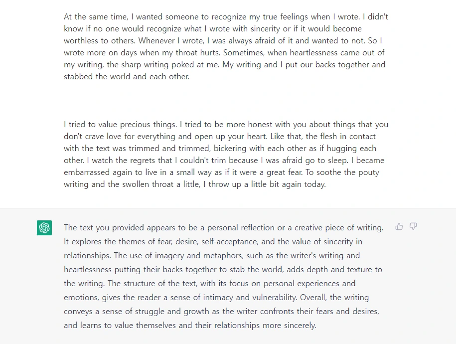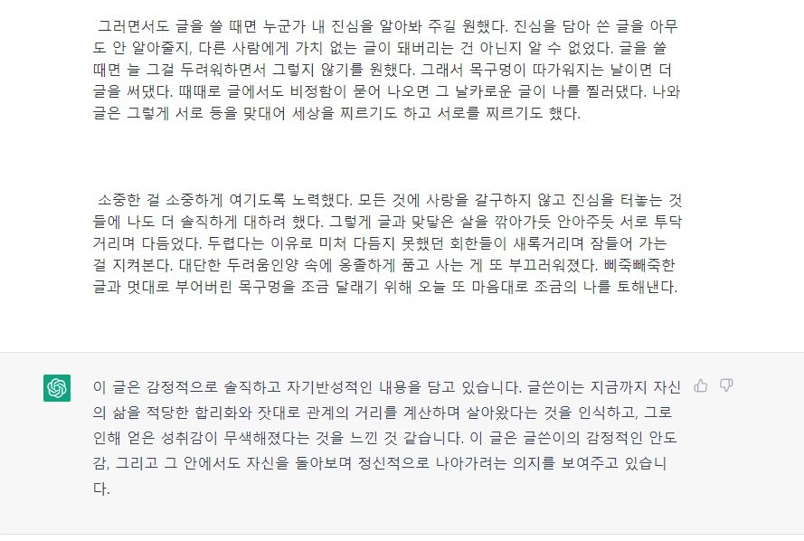 누가 내 글에 대해서 얘기해 줬으면 좋겠다 싶다가도 이렇게 평가를 받으니 조금 어색하다. Chat GPT가 해석한 내용 중에서 '그들의'라는 단어를 내가 가장 두려워했던 '나를 토해내는 일'로만 변환하면 어느 정도 맞는 내용의 평가를 하는 것 같다. 평가, 평가란 말이 좀 낯설다. 내 이야기이니 솔직하게만 쓰자고 생각했던 글이 AI를 통해 평가가 되다니 신기하다. 그래서 내친김에 한글로 적힌 글의 평가도 부탁했다.