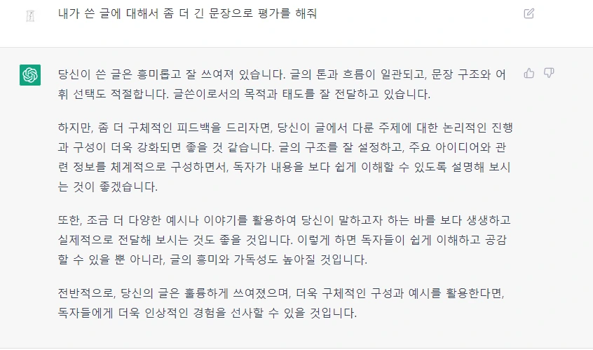 영문 버전과는 다르게 평가가 약간 마음에 안 들었다. 영문 버전에서는 구체적인 단어로 평가를 해주더니 한글 버전은 평가라기보다는 감상 정도에 그쳤다. 그래서 혹시 더 긴 문장으로 평가해 줄 수 있냐고 물었다.