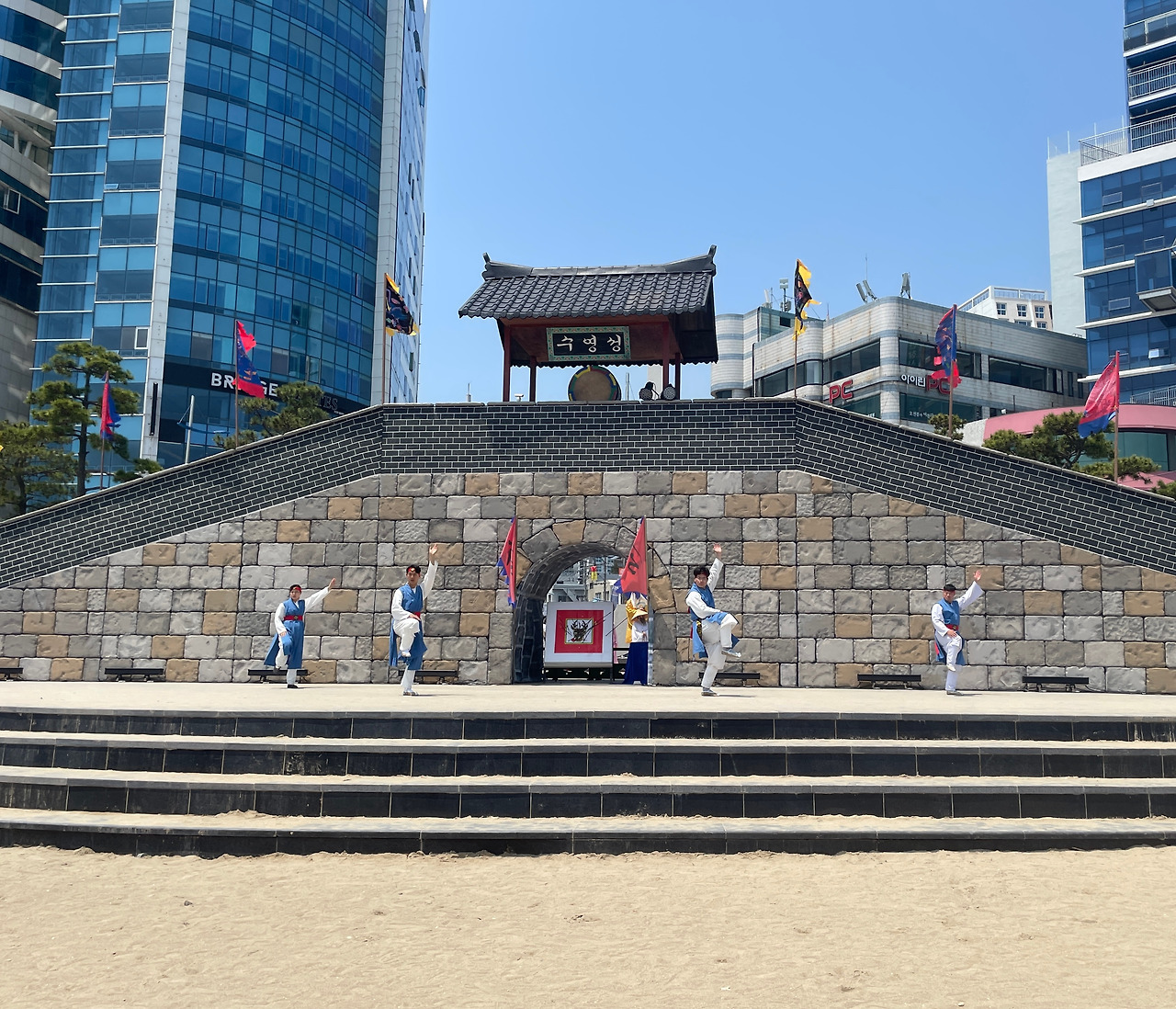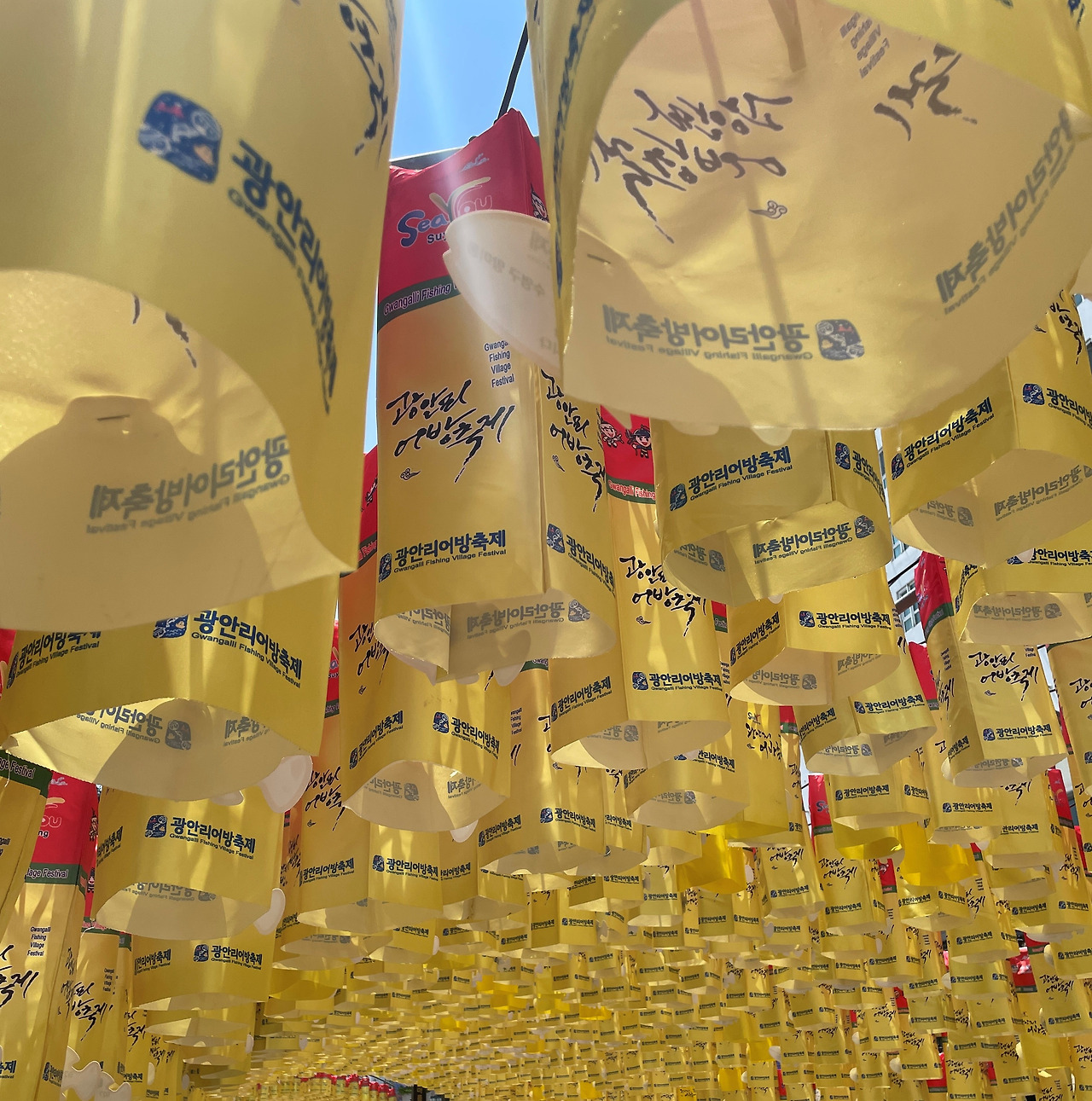 광안리 해수욕장 옆 크게 지어진 성벽을 보고 발걸음을 멈췄다. 광안리의 반대편에 있는 크고 화려한 가게와 대비되는 성벽의 모습에 눈길이 더욱 간다. 그러다 길가를 수놓은 노란 청사초롱을 따라 걸으며 큼직하게 적힌 광안리어방축제 글씨가 옛 추억들을 새록새록 불러일으켰다.
