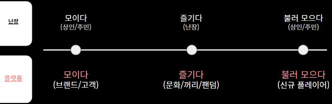 이와 같은 난장의 모습은 플랫폼의 활성화 과정과 유사하다. 특히나 특정 카테고리를 중심으로 전개하는 플랫폼일 수록 더욱 유사한 모습을 보인다. 가령, 패션 플랫폼은 특정 고객층을 타겟으로 한 브랜드를 중심으로 전개한다. 그리고 플랫폼은 유입된 고객이 즐길 수 있는 꺼리를 제공함으로써 고객을 팬으로 만들어 간다.