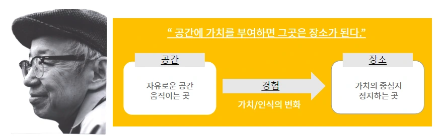 ‘공간 + 경험 =장소”라는 개념이다. 즉, 공간에 가치를 부여하면 그곳은 그때 장소가 된다는 것이다.