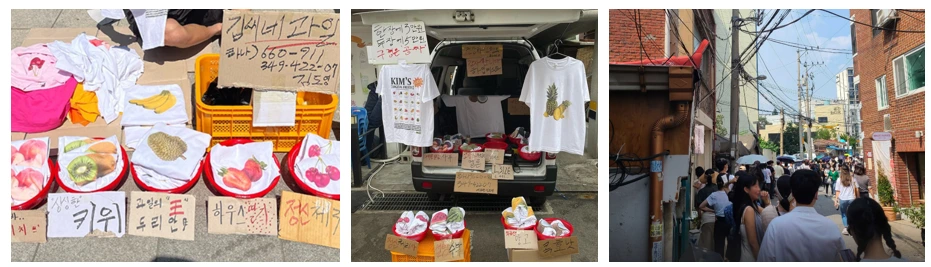 <김씨네 과일가게>가 인기를 끄는 이유는 이 매장만의 개성때문이다. 티셔츠를 좋아하는 것을 넘어서서 티셔츠라는 제품의 스토리에 진심을 담았다. 그리고 그것을 전달하는 디테일함이 핵심이다. 실제 과일판매하는 아저씨들처럼 차량을 타고 다니며, 판매하는 옷차림도 과수원 아저씨를 연상케하는 복장을 유지한다. 그리고 무엇보다 과일(?)이 돋보이게 보이기 위해서 빨간 광주리에 정성껏 담아서 위트있는 박스 종이에 적은 POP를 배치해 둔다. 때로는 기다림에 지친 사람들을 위해서 옆구리에 낀 확성기로 노래도 불러준다.