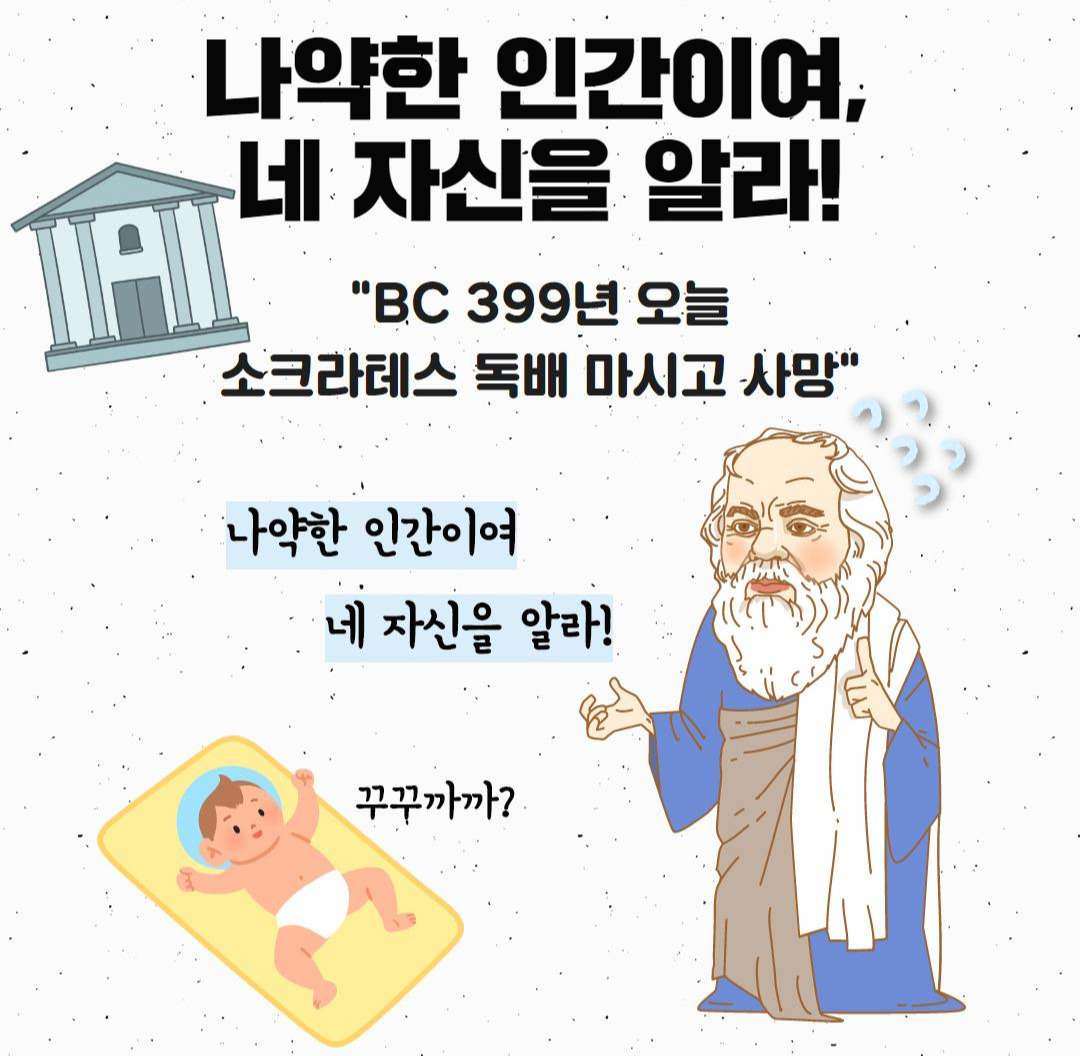 만물의 근원은 물이라고 생각한 탈레스를 필두로 공기, 불, 원자 등을 주장하는가 하면, 피타고라스처럼 ‘수(數)’라고 주장한 철학자도 있었습니다. 그런데 소크라테스가 등장하여 ‘자연’이 아닌 ‘인간’에 대해 탐구하기 시작했습니다. 그리고 사람들과 대화를 나누며 ‘무엇에 대하여 알고있다 착각하지 말고 아무것도 모르는 너 자신의 참모습부터 알라!’고 가르쳤습니다. 이에 잘난 척하며 지식팔이를 하던 소피스트들이 그를 비난하기 시작했고, 결국 신성모독과 청년들에게 악영향을 끼친다는 죄목으로 고발하였습니다. 이후 이어진 재판에서 소크라테스는 치열한 자기 변론을 펼치지만 결국 사형 선고를 받고 말았습니다. 그리고 사형 집행 전 탈옥을 권유한 친구에게 ‘악법도 법이다’라는 유명한 말을 남기고 독배를 마셨습니다.