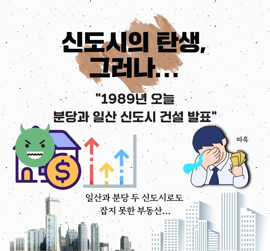 강남개발을 다룬 영화 ‘강남’의 대사입니다. 이렇게 강남부터 시작된 부동산 신화는 ‘3저(저유가, 저환율, 저금리)’ 호황을 누리던 1980년대 중반에 이르러 정점을 찍었습니다. 1987년부터 1989년까지 3년간 부동산가격이 해마다 20~40%씩 상승하자 집 없는 서민들의 상대적 박탈감과 원성도 덩달아 높아졌습니다. 이에 정부는 공급을 늘려 가격을 안정시키겠다는 목적으로 평촌, 중동, 산본 신도시 계획을 발표했습니다. 그러나 ‘마른 논에 물 붓기’식 조치로는 시장을 안정시킬 수 없었습니다. 그러자 1989년 4월 27일, 서울의 남쪽과 북쪽에 각각 하나씩 대규모 신도시를 조성한다는 획기적인 주택 공급 확대 정책을 발표하게 됩니다. 그렇게 탄생한 신도시가 바로 분당과 일산입니다.