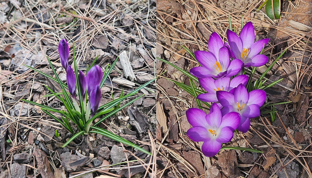 우리 집 크로커스는 첫 해 한 송이 꽃을 보여줬다. 이후 두 해를 더 건너 세 번째 봄, 가족이 생겼다. 꽃대가 하나 올라오는 듯싶더니, 이어서 또 다른 꽃대가 생겼다. 그리고 또 하나, 또 하나. 어느새 다섯 명의 가족이 생겼다. 너무도 사랑스럽고 대견했다. 모두 똑같이 시린 보라색 꽃잎과 샛노란 꽃술을 가진, 순색의 자태였다. 잡초인 줄만 알았던 작은 풀이 힘을 모아 가족이 되다니. 가슴 떨린 감동이 느껴졌다. 이렇게 아름다운 식구들이 어디 있단 말인가. 지금도 크로커스는 하나 둘 꽃을 늘리며 그 생명을 이어가고 있다. 인간은 알 수 없는 자연의 시간 속을 뜨겁게 살아내고 있다. 추위가 남은 이른 봄, 꽃을 보여주는 크로커스는 내겐 작지만 가장 강한 친구다.