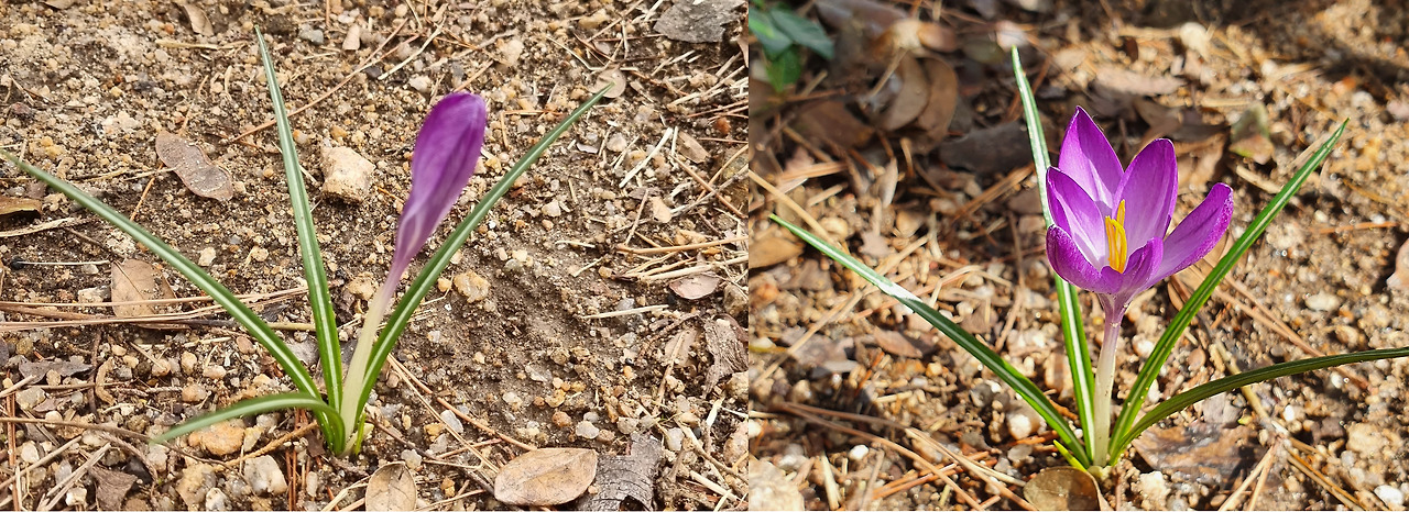 다음해 이른 봄, 그 작고 강한 싹이 나왔다. 어디에 심어 놓았는지, 내가 저런 것을 옮겨 놓긴 한 건지 잊은 상태였다. ‘이게 뭐지’, 알 수 없었다. 그리고 며칠 후 진한 순색의 꽃이 피었다. 너무 신기해서 탄성을 질렀다. 이렇게 아름다운 보라색이라니, 이렇게 샛노란 꽃술이라니! 새끼손가락 한 마디보다 작은 구근이었다. 여린 풀이 견디지 못하고 죽었다 생각했다. 추운 겨울바람에 땅이 꽁꽁 얼어붙어 사라진 줄 알았다. 그런데 이 녀석이 생명을 이어서 꽃을 피우다니. 아, 이놈들은 시간폭탄이었구나. 한 자리에서 온갖 것을 견뎌내고 응축한 에너지를 터뜨리는, 아름다운 시간폭탄이었구나.