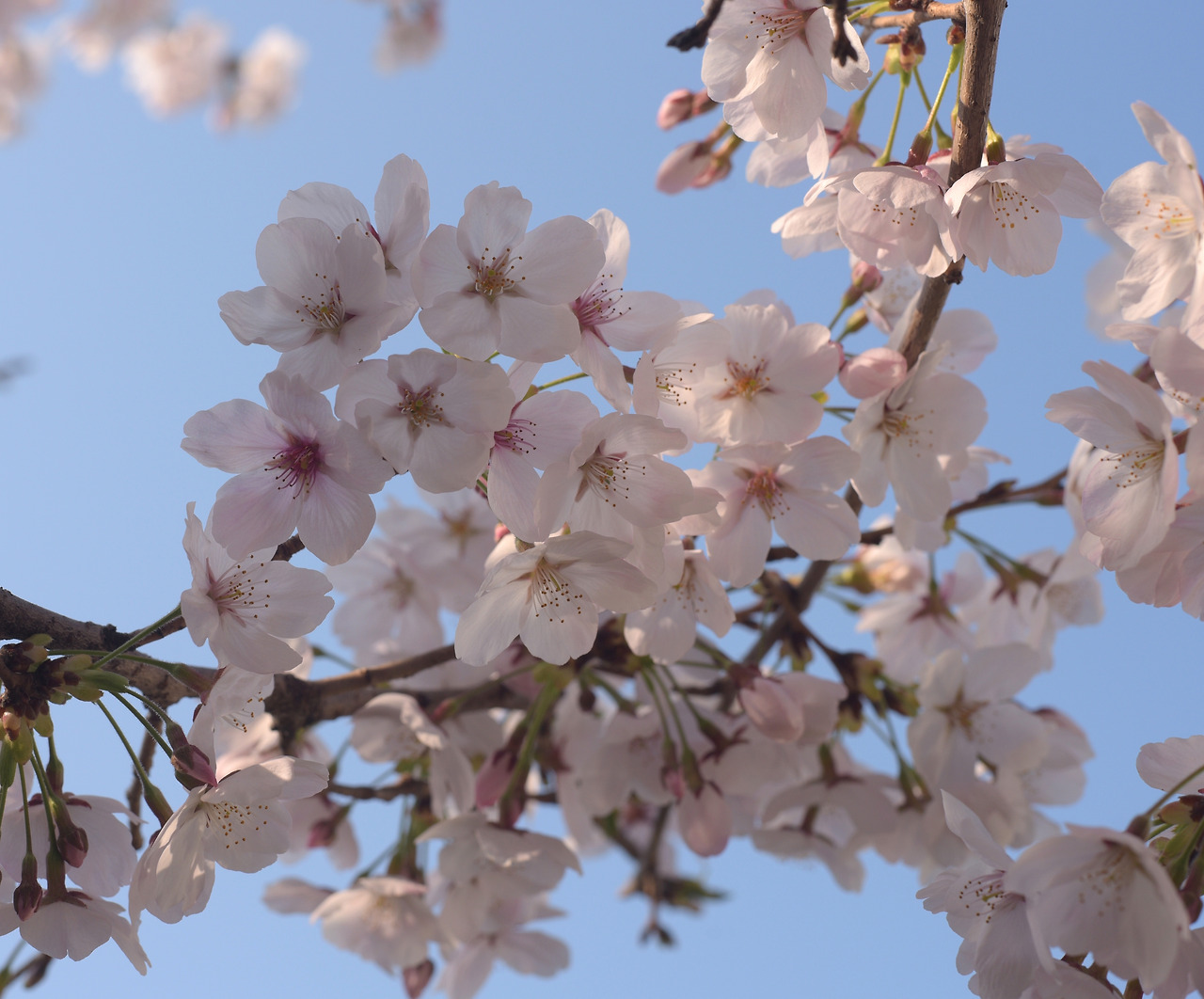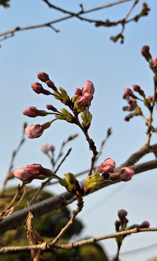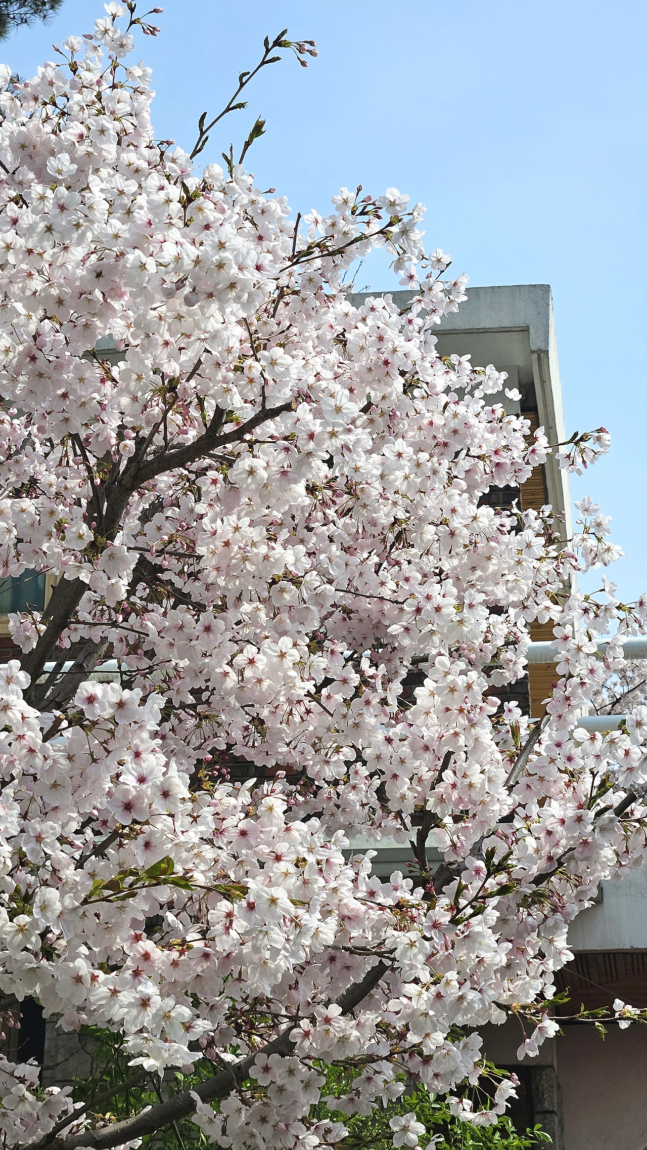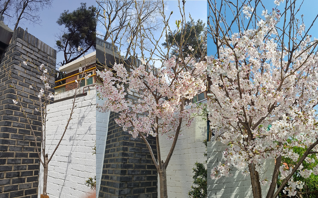 아무래도 묘목이라 처음에는 왜소했다. 나무를 심은 다음 해, 조촐하게 꽃이 폈다. 수형을 예쁘게 잡기 위해 곁가지를 잘라낸 상태여서 더 그렇게 보였다. 손에 꼽을 만큼 수수하게 꽃이 달렸다. 그래도 좋았다. ‘이 정도가 어디인가. 살아 있음 됐다.’ 하지만 웬걸, 벚나무는 해가 다르게 쑥쑥 자랐다. 작년의 그 나무가 맞나 싶을 만큼 성장했다. 앙상했던 가지는 어른 팔뚝보다 굵어졌다. 거기에 다시 건강한 가지들이 뻗어 나가고 촘촘히 꽃망울이 맺혔다. 연둣빛 자루에 자그마한 분홍 구슬이 달린 응원봉 모양이다. 열성팬들이 모여 봄이 오심을 환영하는 것 같다. 그리고 날이 따뜻해지면 눈부시게 꽃이 핀다. 처음엔 팝콘 몇 개 달려있던 것 같던 나무가 한해 자라 커다란 꽃다발같이 되었다. 그다음 해엔 집 바깥 담장을 다 덮을 만큼 꽃이 맺혔다. 이젠 든든한 성목으로 그 자태를 한껏 뽐낼 수 있게 되었다.