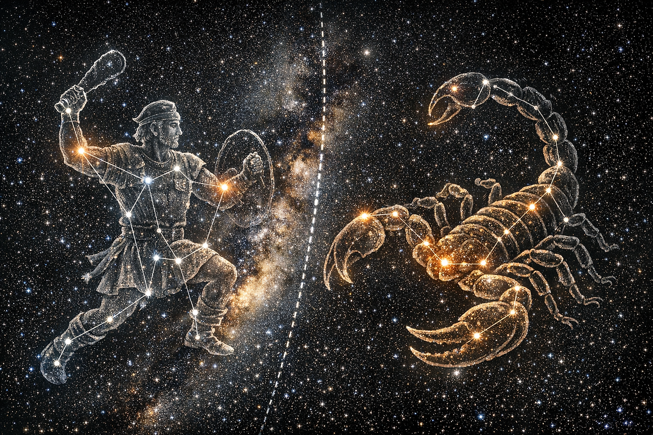 이렇게 만들어진 꼴이 반복적으로 인식되면, 인간은 그 형태에 이름을 붙이고 의미를 부여하기 시작한다. 먼저 눈에 들어오는 것은 사냥꾼의 실루엣이나 전갈의 꼬리 같은 시각적 구조다. 오리온과 전갈이라는 신화는 그다음에 덧붙여진 이야기다. 다시 말해 신화는 형태가 먼저 만들어지고, 그 형태를 설명하기 위해 뒤늦게 탄생한 서사다. 특히 하늘에서 서로 180도 떨어진 오리온자리와 전갈자리의 배치는 ‘전갈이 뜨면 오리온이 숨는다’는 도망의 이야기를 거의 필연적으로 만들어낸다. 서사는 형태가 만든 구조적 긴장을 인간이 감당하기 위해 선택한 해석 방식이다. [3]