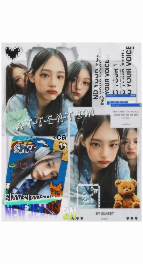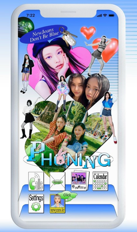 뉴진스의 경우, 에스파의 경향과는 사뭇 다른 모습을 보인다. 좌측 이미지는 뉴진스의 공식 앱 'Phoning'의 화면, 우측 이미지는 핀터레스트에서 발견한 창작 그래픽이다. 두 그래픽에서 눈에 띄는 점은 '자유분방'하다는 점이다. 두 이미지 모두 2000년대의 다꾸, 폰꾸 감성을 기반으로 하여 재치 있게 이미지들을 배치하였다. 그 배치가 완벽하지 않고 조금은 과하더라도 오히려 그 점이 매력으로 다가온다. 픽셀 아트 레터링, 구식 윈도 화면창, 복고적인 2D 그래픽들은 촌스럽긴커녕, 새롭고 위트 있게 느껴진다.