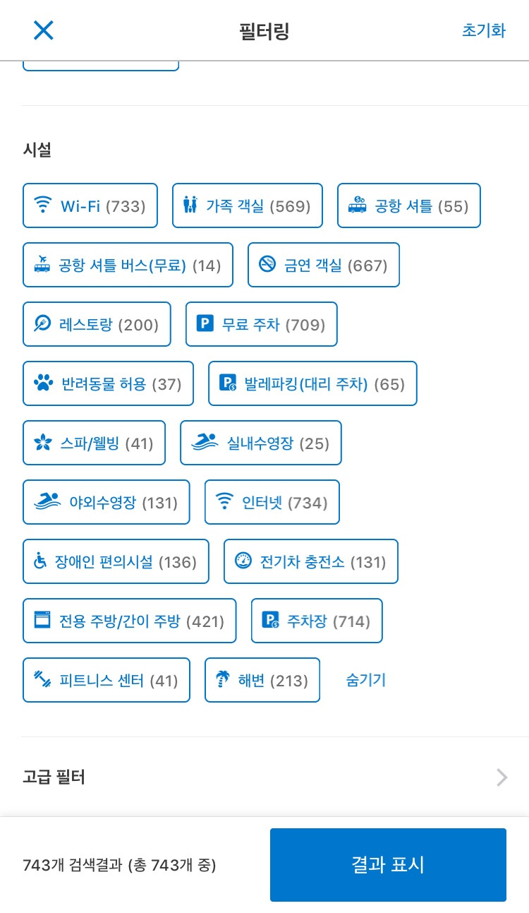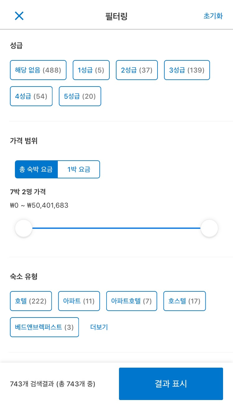 위 그림에서 알 수 있듯, 보통 필터는 정렬보다 기능도 많고 복잡합니다. '숙소 유형'이라는 하나의 기준 내에서도 중복 선택이 가능하며 서로 다른 기준을 조합해서 사용할 수도 있습니다. 또한 필터를 적용했을 때 결과 개수가 달라질 수 있기 때문에 이를 하단에 미리 보여주기도 합니다.