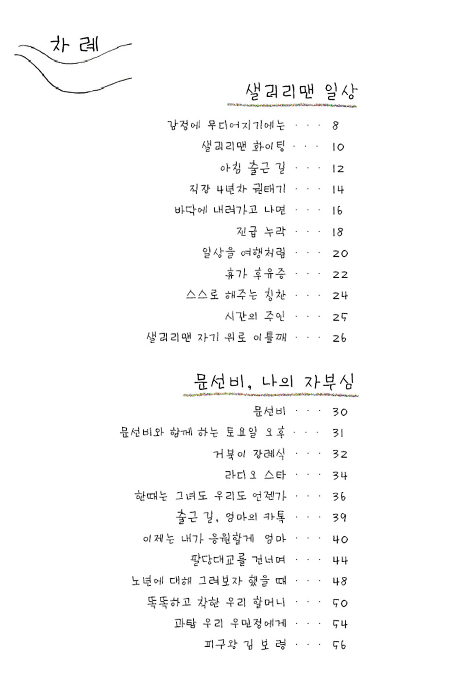 아침 출근길, 진급 누락, 직장 권태기, 여름 휴가, 아빠, 엄마, 돌아가신 할머니, 우민정과 김보령, 서른 맞이, 새해 다짐.