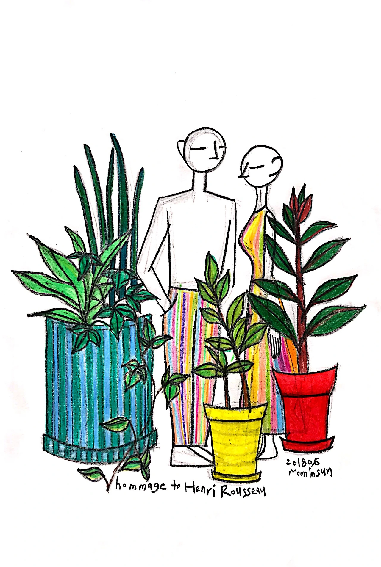 약간 틀어진 얼굴의 형태나 몸의 선, 그 왜곡된 비례가 오히려 독창적이고 환상적인 느낌을 주어서 인상적이었다. 형광펜처럼 번쩍이는 생생한 색깔이 좋아서 십년 전, 반고흐만큼이나 좋아했던 앙리 루소가 선데이 페인터였다는 것을 얼마 전 잡지를 보다가 알게 되었다.