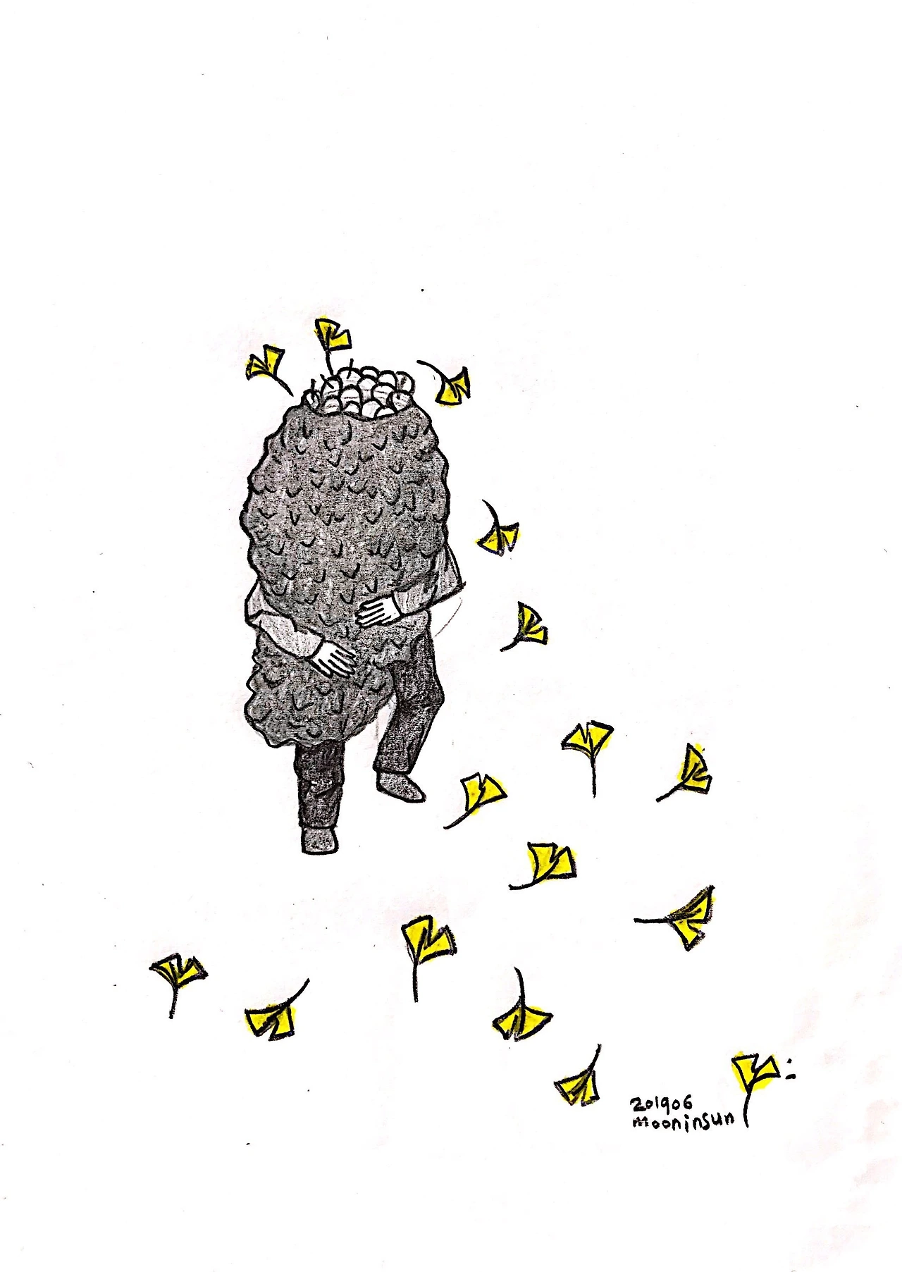 오늘은 자기 몸의 반절은 되겠는 은행을 가득 담은 주머니를 가슴 가득 안고 간다.