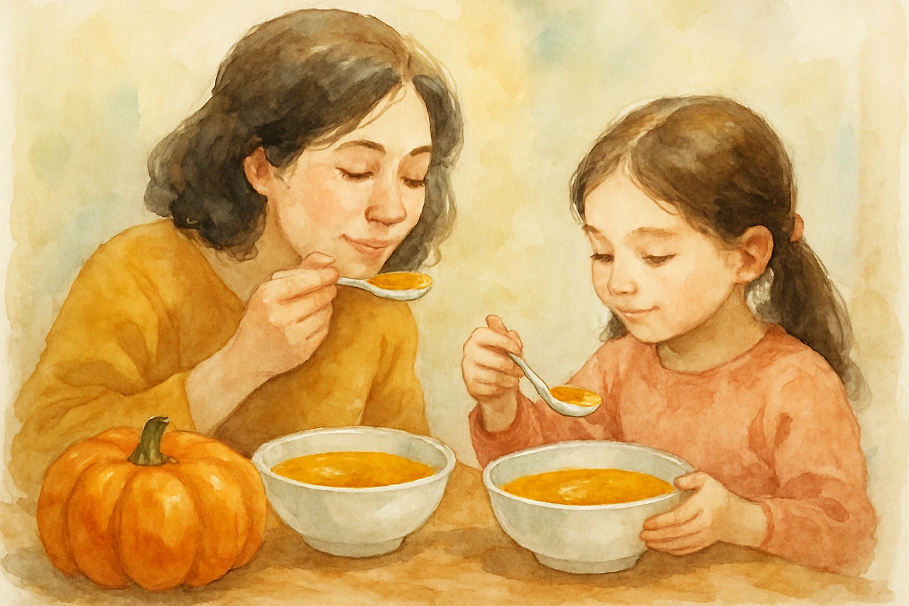나는 호기심 어린 눈빛으로 다가가 엄마 옆에 섰다. 그녀가 칼로 호박을 반으로 가르자, 촉촉한 단내와 함께 노란 속살이 드러났다. 씨앗을 숟가락으로 긁어내는 소리는 사각사각 귀에 경쾌하게 울렸다.