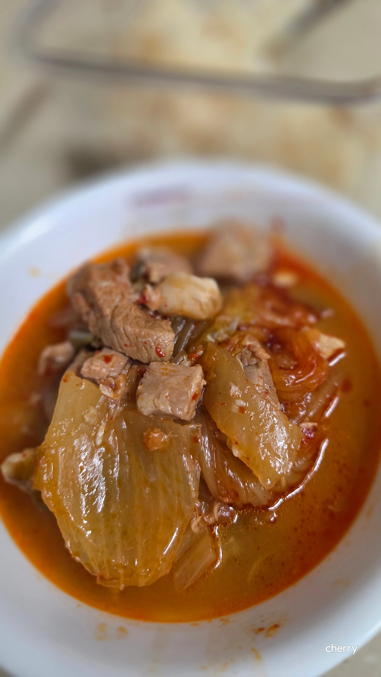 묵은지를 손으로 꽉 짜니 시큼한 국물이 손가락 사이로 흘렀다. 팬에 참기름을 두르니 고소한 향이 먼저 튀어 올랐다. 묵은지가 달라붙는 소리, 주걱으로 눌렀을 때 터지는 촉감, 공기 중에 번지기 시작한 하얀 김까지 엄마의 부엌 냄새가 되살아나는 순간이었다. 마지막에 버터 한 조각을 떨어뜨리니 녹아내리는 버터가 찌개 전체를 감싸며 고소한 풍미가 만들어졌다. 기름이 동글게 퍼지며 오묘한 황금빛을 만들어냈다.