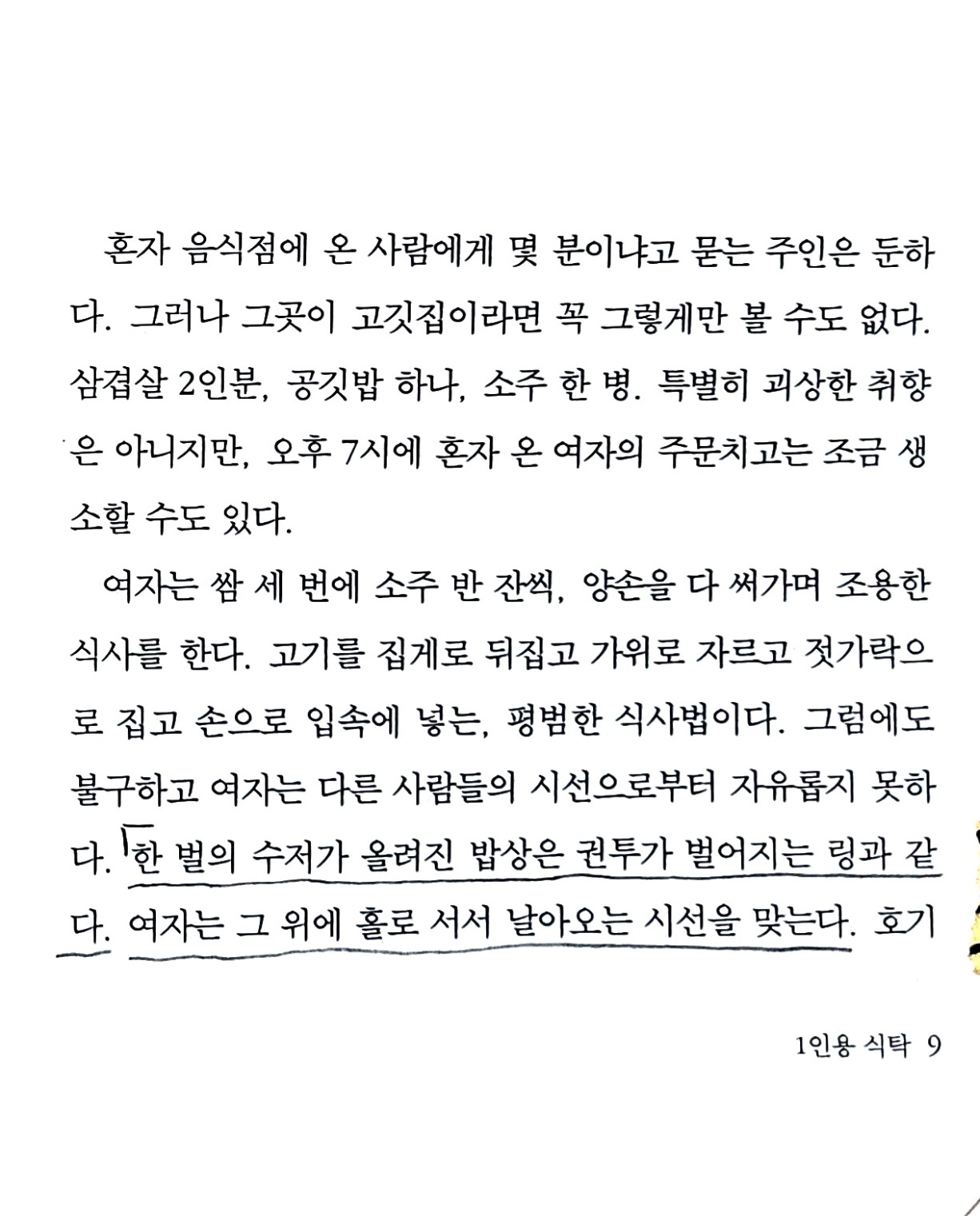 〈1인용 식탁〉을 다 읽고 나면 자연스럽게 나의 식탁을 떠올리게 된다. 오늘 나는 누구와 밥을 먹었는지, 혹은 누구와 먹지 않았는지. 혼자라는 사실이 편안했는지, 아니면 애써 무뎌진 감정이었는지.