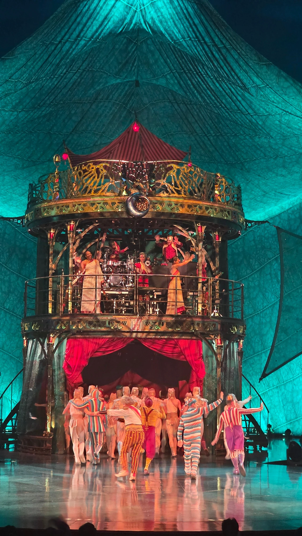 공연이 시작되자마자 무대 위는 순식간에 다른 세계가 되었다. 광대의 과장된 몸짓과 갑작스러운 음악, 불안정해 보이는 구조물 위를 뛰어다니는 곡예사들이 연달아 등장했다. 줄 하나에 의지해 공중을 가르는 장면에서는 객석 여기저기서 감탄사를 연발하는 소리가 동시에 났다. 바퀴 달린 철제 장치 위에서 회전하는 퍼포먼스가 펼쳐질 때는 현실의 중력감각이 잠시 사라지는 기분마저 들었다.