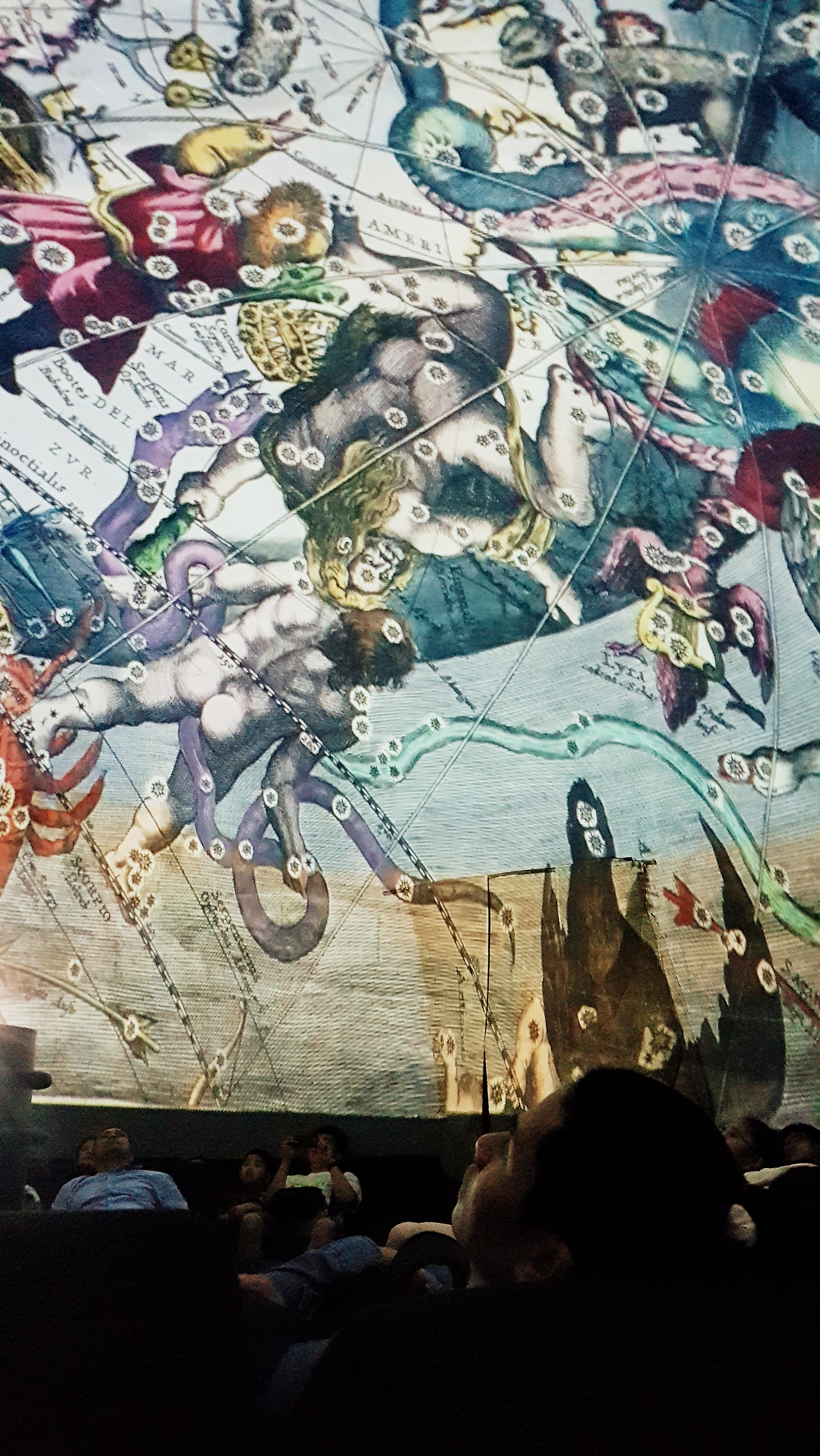 특히 시간별로 계속 상영되었던 여러 가지 주제의 우주 다큐 관람이 가장 즐거웠다. 상영관이 크기는 작았지만 360 돔 상영관이라서 시원한 에어컨 바람을 즐기며 거의 누운 자세로 캄캄한 밤하늘을 쳐다보듯이 영상물을 즐길 수 있었다. 둥근 하늘 위로 펼쳐지는 하늘과 머나먼 우주의 영상이 다이내믹하게 펼쳐지면서 가끔 좌석이 회전하거나 위아래로 움직이는 듯한 착각이 들 정도로 몰입감이 대단했다. 해설은 모두 (당연히) 영어였기 때문에 나는 아이의 한쪽 귀에 손을 대고 귀속말을 하듯이 빠르게 (어설프나마) 통역을 해주었다. 종종 내가 잘 모르는 별의 이름이나 용어는 별 수 없이 들리는 대로 전달해주면 아이가 그것들을 다시 나에게 설명해주기도 했다. 서로가 배우는 것이 많은 시간이었다.