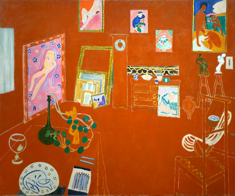 또 다른 마티스의 빨강을 느낄 수 있는 작품이 있다. 〈붉은 스튜디오(L'Atelier rouge)〉가 처음 공개되었을 때 관람자를 당혹스럽게 만들었다. 이 그림은 독특하고 모순적인 이미지로, 창작 이후 후원자와 비평가들에게 도전을 받아왔다. 붉은 스튜디오는 파리 외곽에 있는 마티스의 Issy-les-Moulineaux 스튜디오를 그린 것이고, 이 스튜디오는 마티스가 직접 디자인한 것으로 알려진다. 1420년대부터 마네, 드가, 모네, 세잔 이래로 화가들은 회화를 지배해 온 공간의 환상을 약화하기 위해 노력했는데, 공간적 환상이 회화의 완전성을 떨어뜨리는 결함으로 여겼기 때문이었다. 하지만 아방가르드의 초기 화가들이 보여 주었듯, 그림에서 환상을 없애는 것은 거의 불가능한 일이었다. 우리의 시각은 3차원 공간을 기대하도록 훈련되어 있고, 어쨌든 그림에서 그것을 찾으려고 한다.