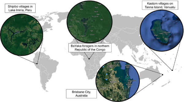 호주의 학자들은 분홍에 대한 지역별 아동의 선호도를 조사하기 위하여 전 세계에서 세 개의 소규모 사회를 찾아냈다. 그 마을의 위치는 아래 사진에 있듯 페루 이미리아호의 Shipibo 마을, 콩고 공화국 북부의 Bayaka 마을, 바누아투 타나섬의 Kastom 마을이다. 이 세 개의 마을은 서로 상대적으로 독립적이며 대부분의 주민들이 현대식 문화의 시스템에서 교육을 받지 않았고 텔레비전, 인터넷 또는 라디오와 같은 대중 매체를 사용하지 않으며 공장에서 생산된 옷과 같은 대량 생산 품목을 거의 사용하지 않는다는 공통점이 있다. 또한 이 마을들은 큰 지역의 도시 중심에서부터 멀리 떨어져 있다. 비교군으로는 도시 문화의 영향을 크게 받는 호주 브리즈번 시의 아이들로부터 데이터를 수집했다.